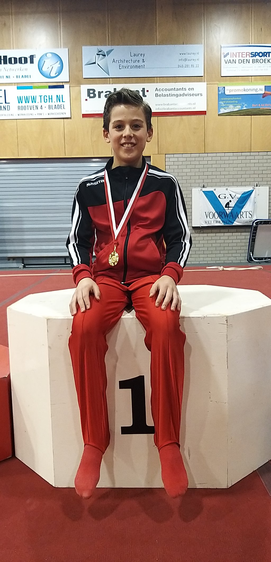 In de laatste wedstrijd van het weekend kwam Wouter van den Brandt in actie. Hij turnt bij de pupillen 2e divisie en is op dit moment de enige turner uit Limburg die dit niveau haalt. Zijn wedstrijd begon op brug, waar hij met een wonderbaarlijke redding zijn handstand pak-pak kon redden en zo binnen de brug bleef. Toen de rekstok, waar hij voor het eerst zijn kip-losom-slinger combinatie turnde in een wedstrijd, Super! Op vloer lukte zijn salto-salto heel erg goed en ook de voltige ging geweldig Hij had de moeilijkste voltige-oefening van alle deelnemers. Hierna kwamen de ringen waar hij, ondanks een klein foutje in zijn oefening, ook weer een prachtige score neerzette. Wouter zat lekker in de wedstrijd en sloot zijn wedstrijd af met twee geweldige sprongen, waarvoor hij ook een half punt bonus mocht ontvangen.
