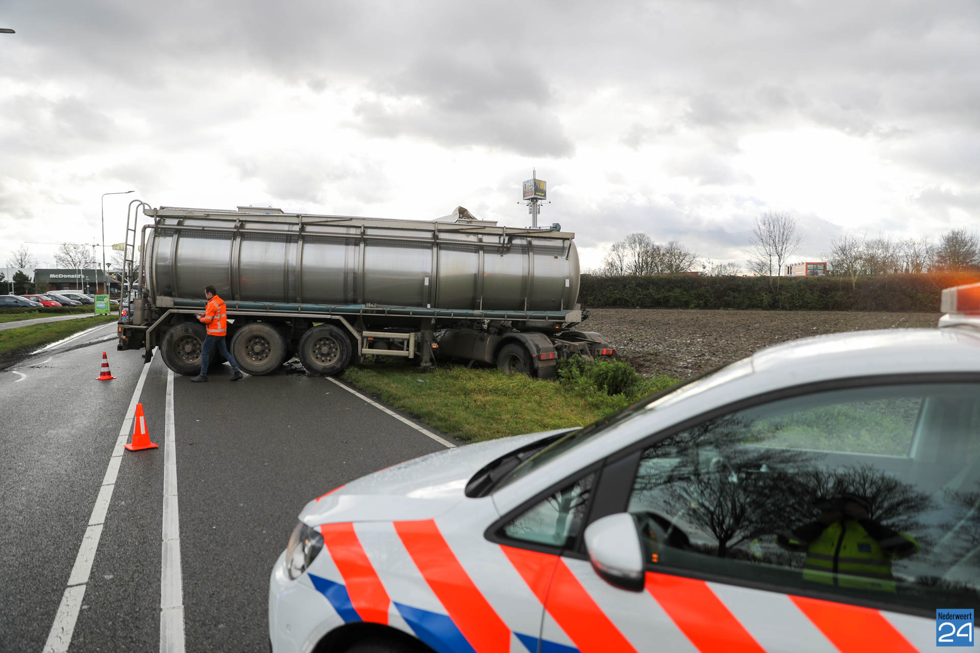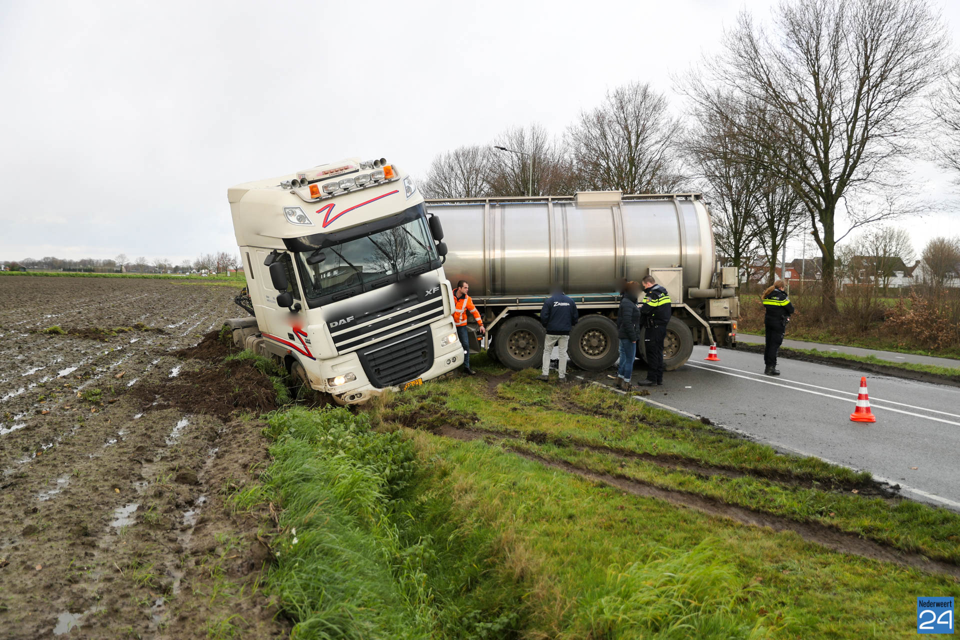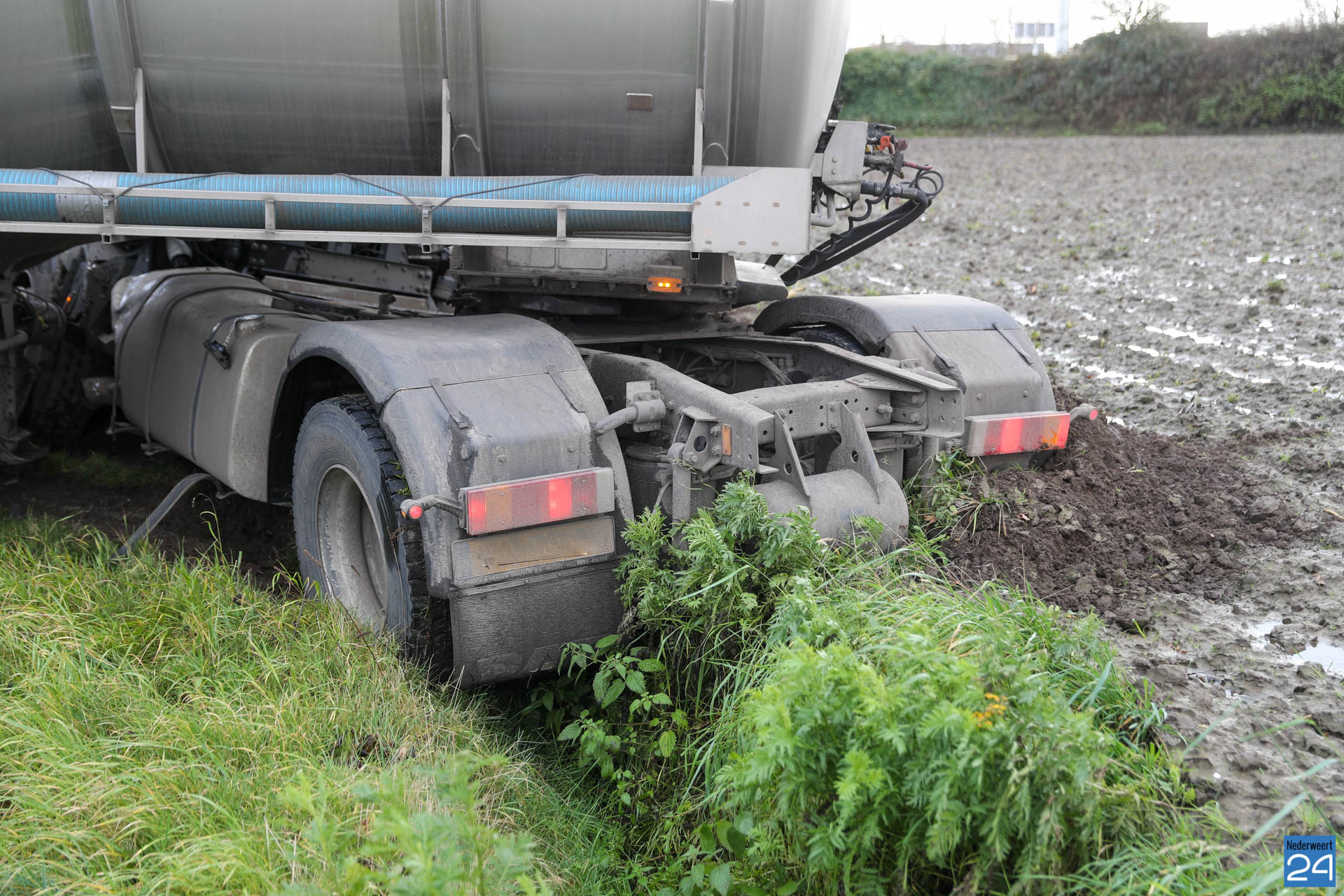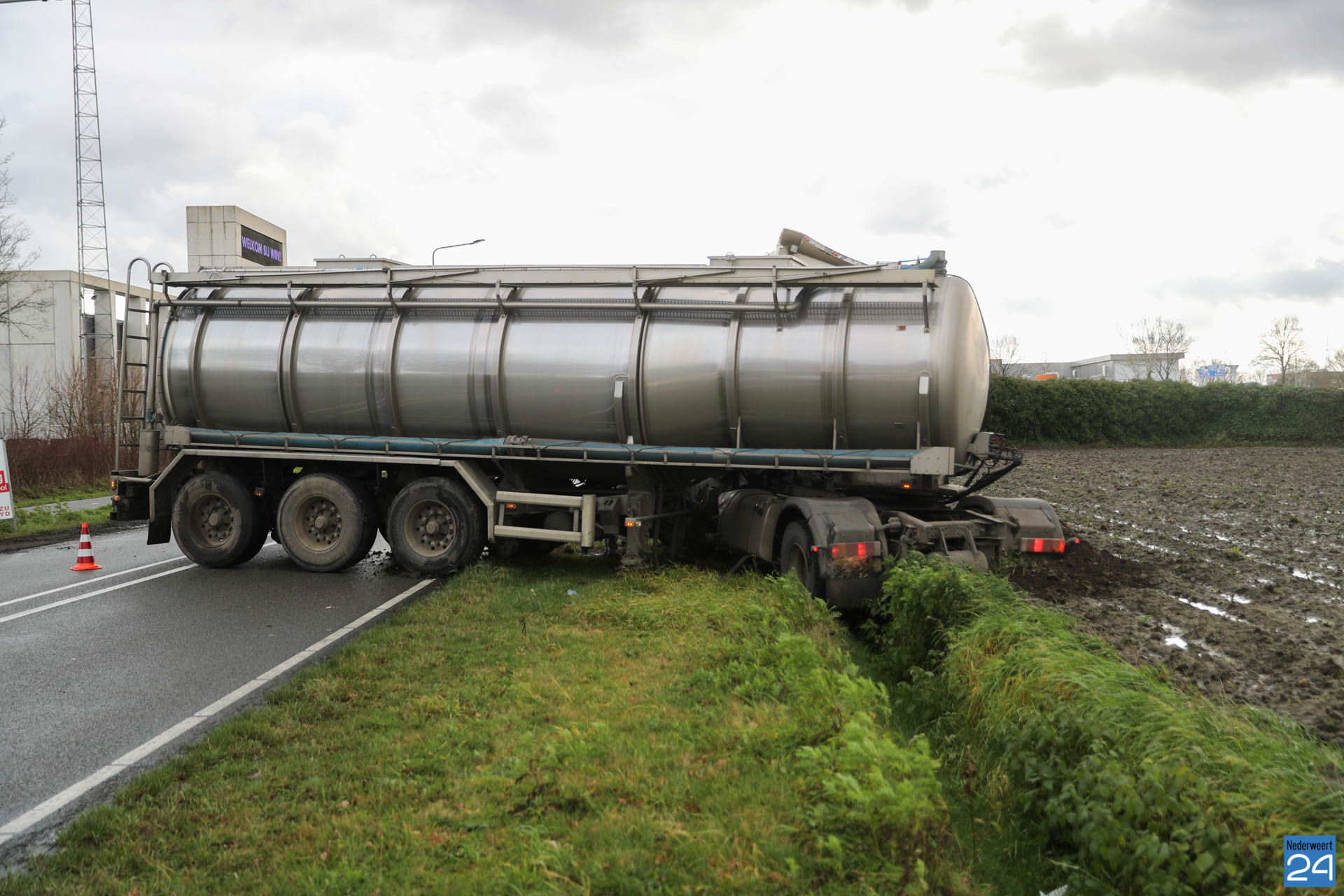 Dinsdagmiddag is een vrachtwagen met aanhanger in de sloot terechtgekomen op de Randweg West in Nederweert. Bij het ongeval raakte niemand gewond.