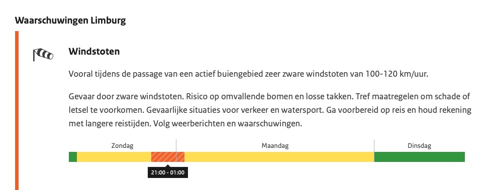 Vanaf de tweede helft van de middag neemt de wind verder toe en komen er in het noordwesten zeer zware windstoten van 100-120 km/u voor. Verder landinwaarts zijn pas in de avond zeer zware windstoten van 100-120 km/u mogelijk, vooral tijdens de passage van een gebied met stevige buien. Voor de zeer zware windstoten is code oranje van kracht. De wind komt uit het zuidwesten, in de loop van de avond uit het westen.