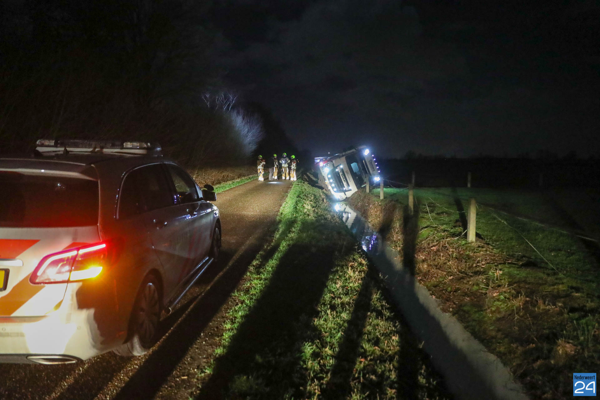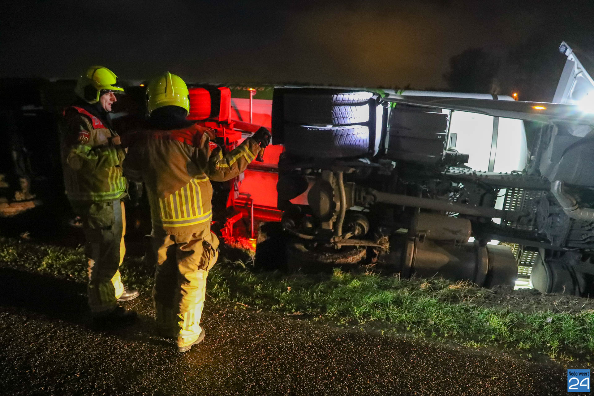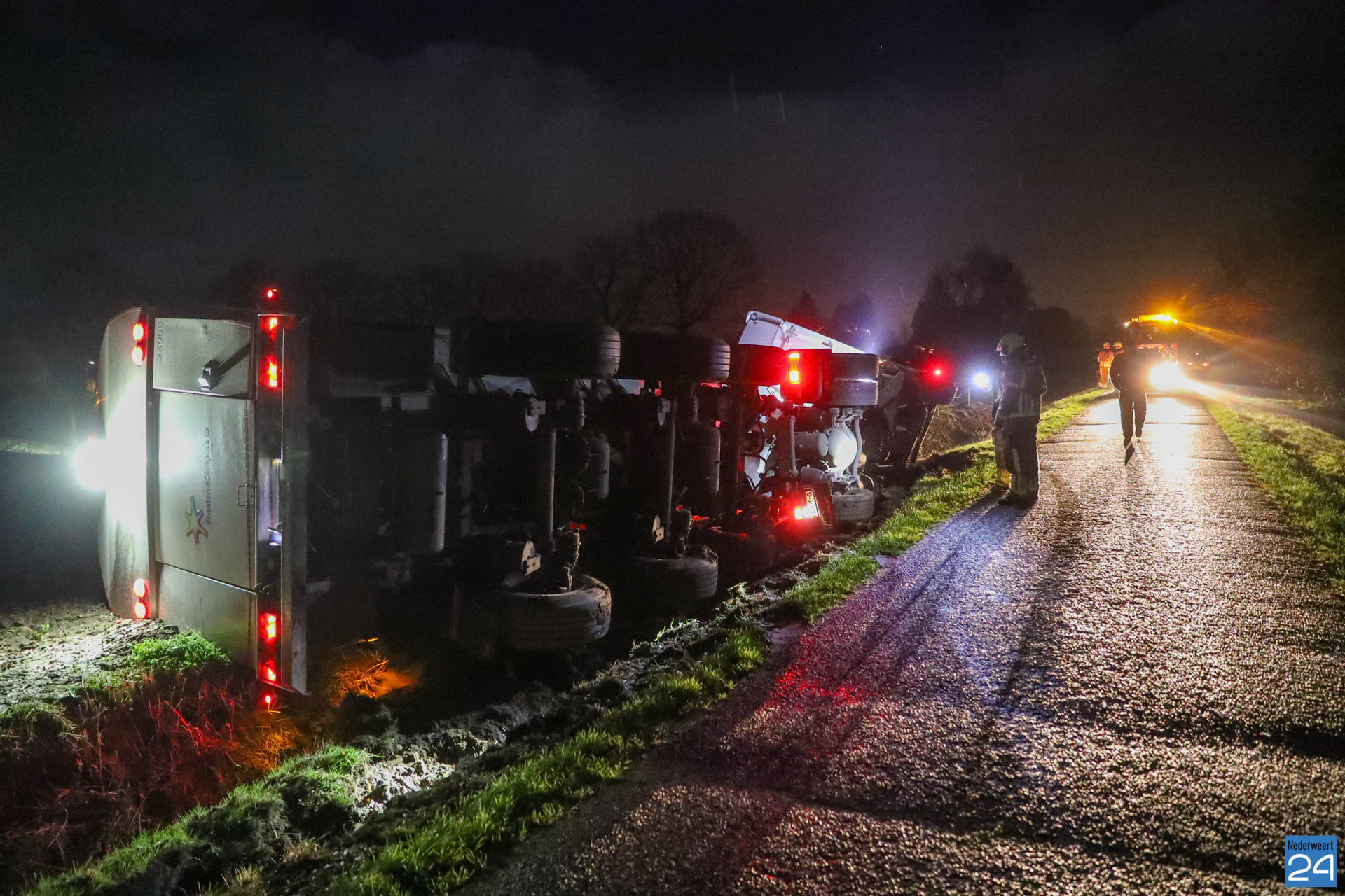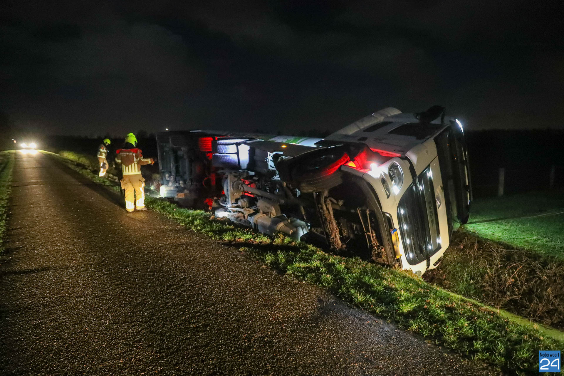 De melkwagen reed op de Hollander toen hij door een stevige windvlaag de macht over het stuur verloor. De vrachtwagen belandde hierdoor op zijn zijkant in de sloot. De chauffeur kwam met de schrik vrij.