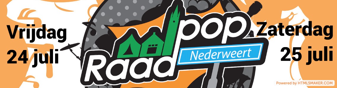 Raadpop 2020In het weekend van 5 en 6 juni vindt op het Raadhuisplein in Nederweert de 6de editie van Raadpop plaats met top Nederlandse bands als Racoon, Di-Rect en Maan. Raadpop (Nederweert) en Bospop (Weert) maken deze editie samen mogelijk. In afwijking van voorgaande jaren zal op vrijdag 5 juni een line up gehost worden door Bospop, voor dit programma wordt entree gevraagd. Dit in tegenstelling tot de gratis toegankelijke zaterdag van Raadpop.