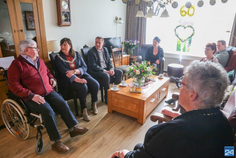 Op donderdag 13 februari waren Hennie en Lies van der Wallen-de Leeuw uit Nederweert 60 jaar getrouwd. Burgemeester Op de Laak en wethouder Koolen kwamen het diamanten paar feliciteren. Hennie werkte ruim 40 jaar in de bouw en Lies zorgde voor het huishouden. Ze kregen 7 kinderen, die samen voor 12 kleinkinderen en inmiddels 10 achterkleinkinderen en nog eentje op komst zorgde.
