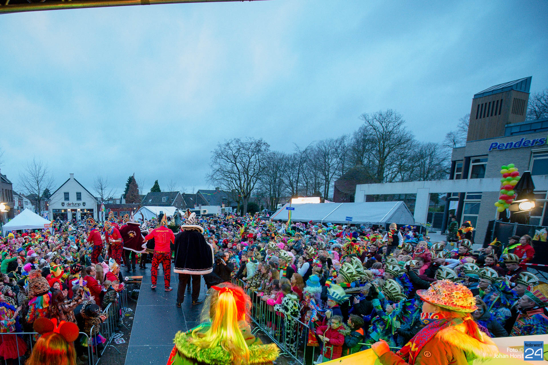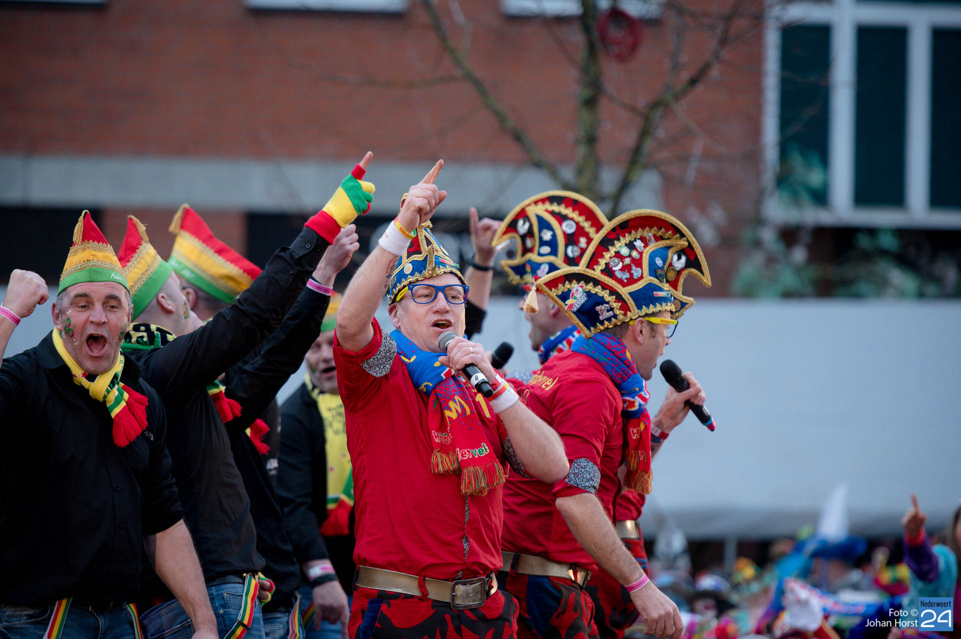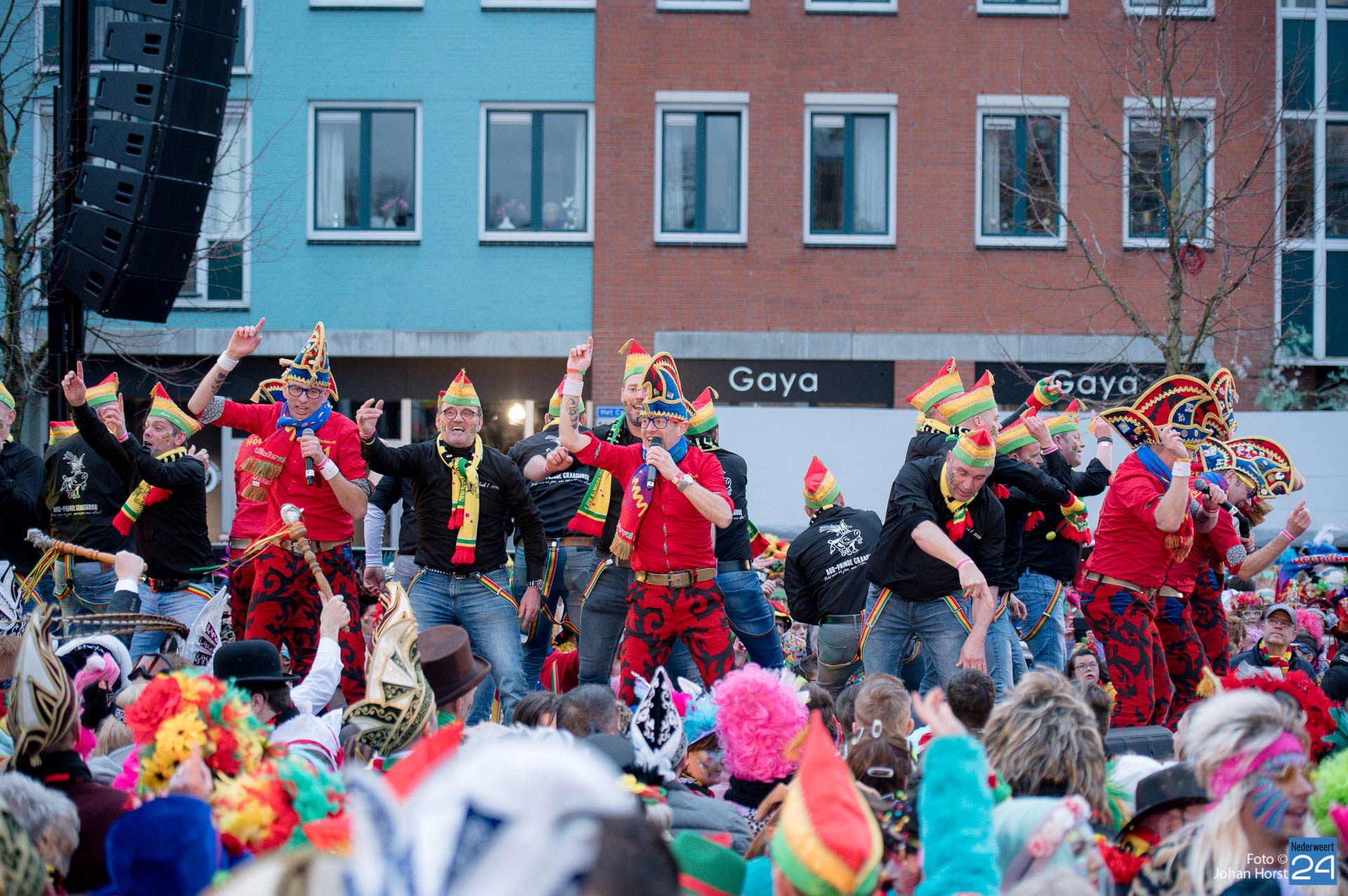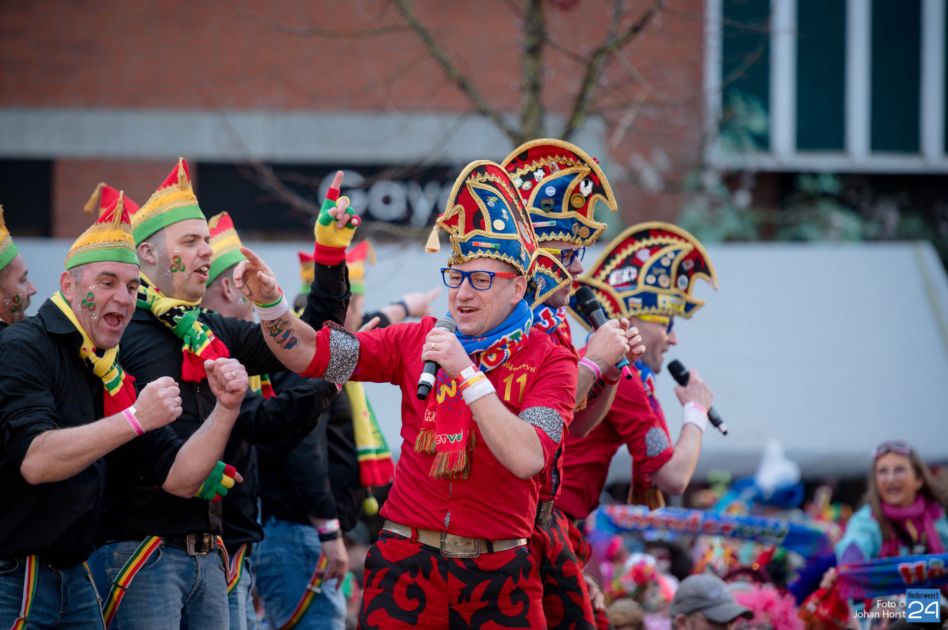 Het plein in Heythuysen stond flink vol met rood geel en groen. De eerste weekenddag van het carnavalsfeest betekent in Heythuysen muziek. Veel artiesten uit deze regio scoorden goed op de Limburgse festivals. Een paar druppeltjes verhinderde niet dat er volop werd meegedeind met de muziek.