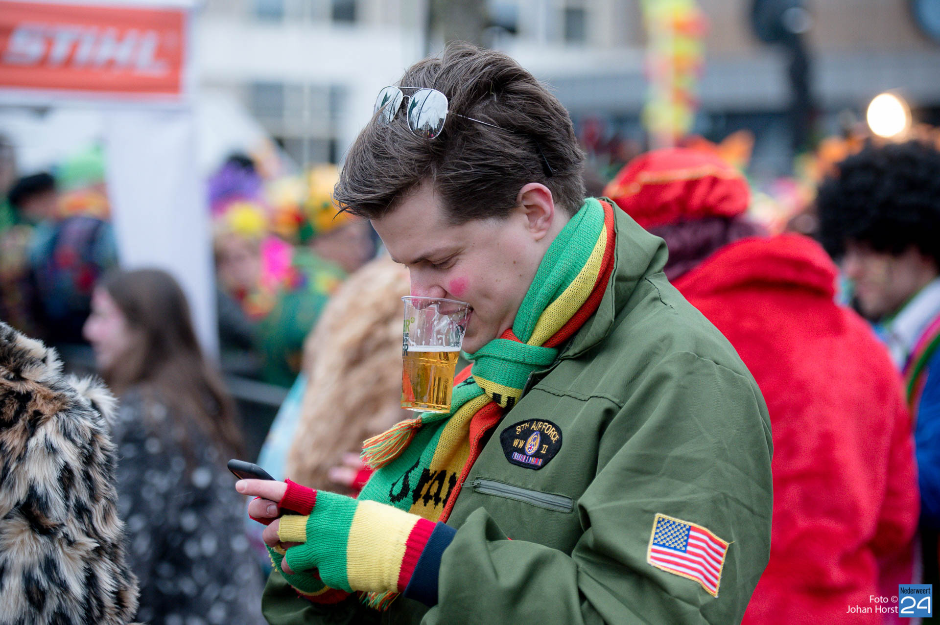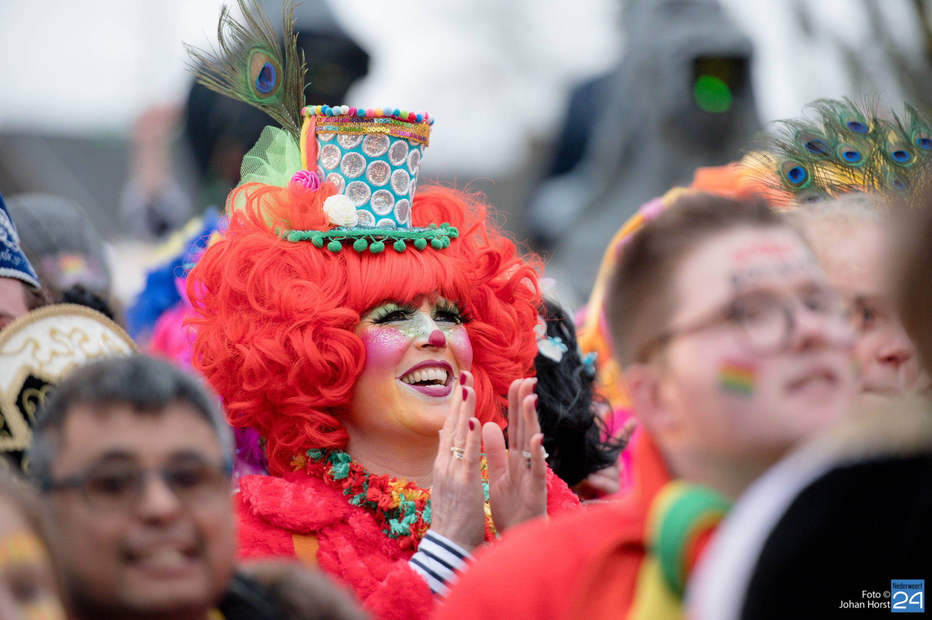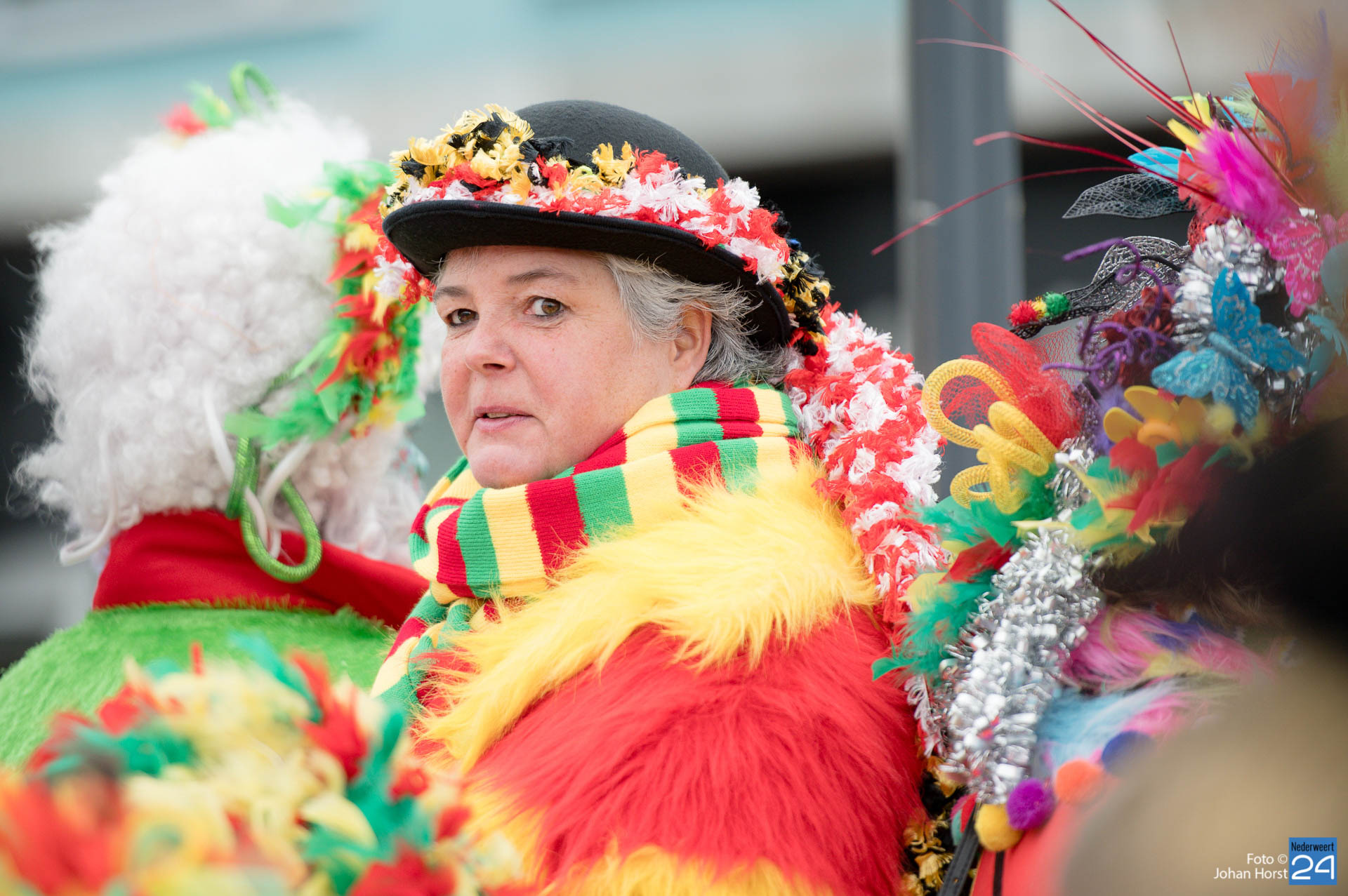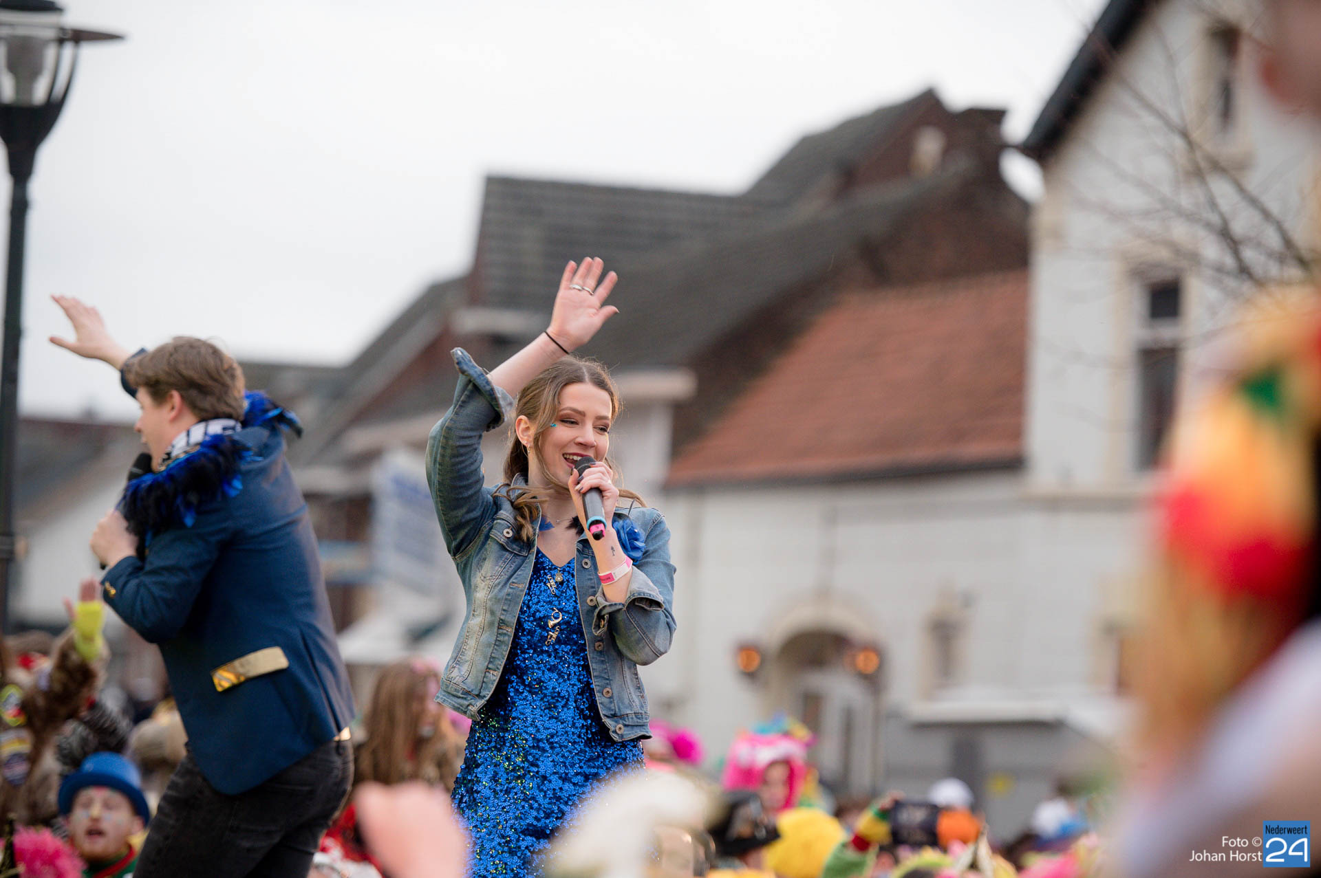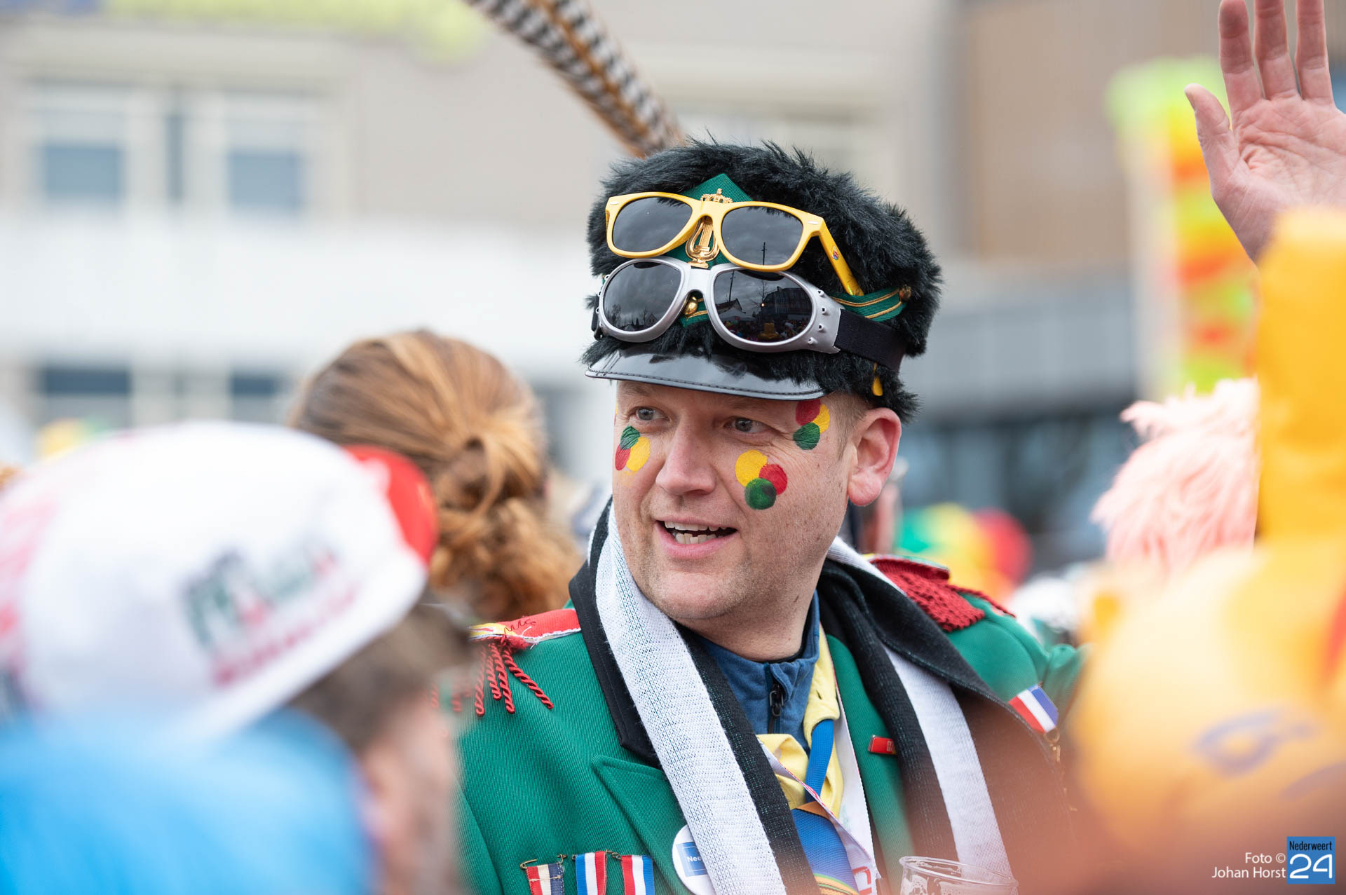 Het plein in Heythuysen stond flink vol met rood geel en groen. De eerste weekenddag van het carnavalsfeest betekent in Heythuysen muziek. Veel artiesten uit deze regio scoorden goed op de Limburgse festivals. Een paar druppeltjes verhinderde niet dat er volop werd meegedeind met de muziek.