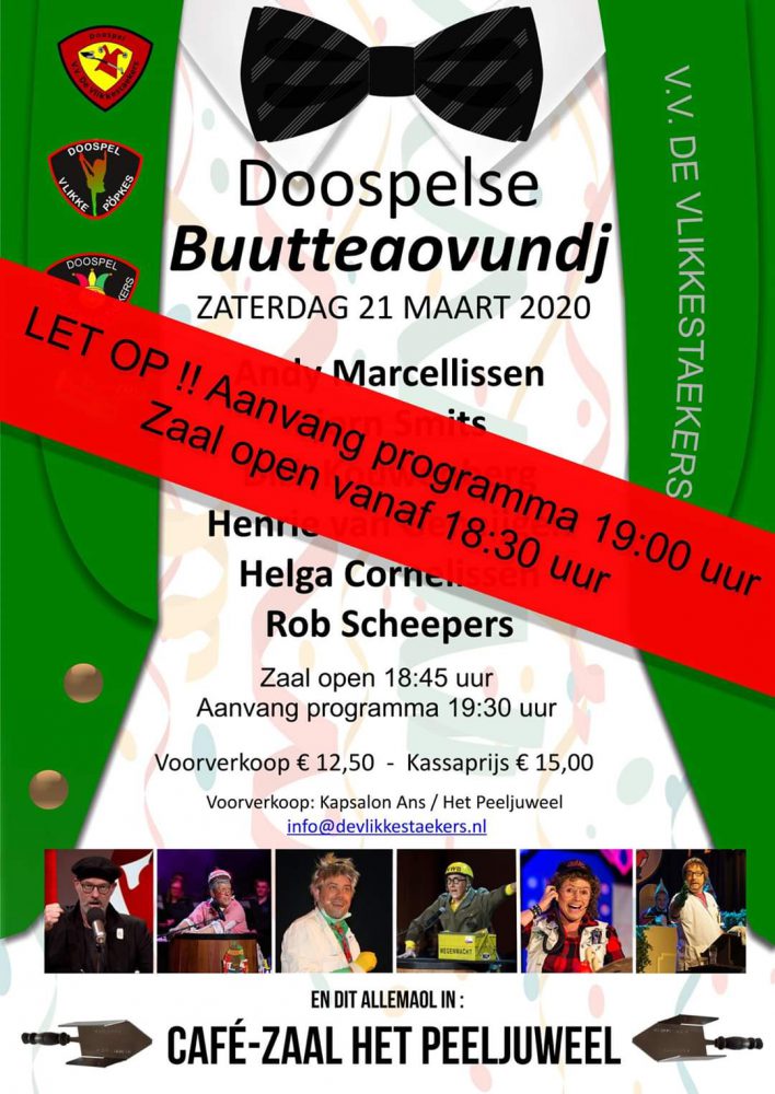 Zaterdagavond 21 maart 2020 vindt er in Ospel de ‘Doospelse Buutteaovundj’ plaats in Café/Zaal Het Peeljuweel. Het evenement wordt georganiseerd door V.V. De Vlikkestaekers.