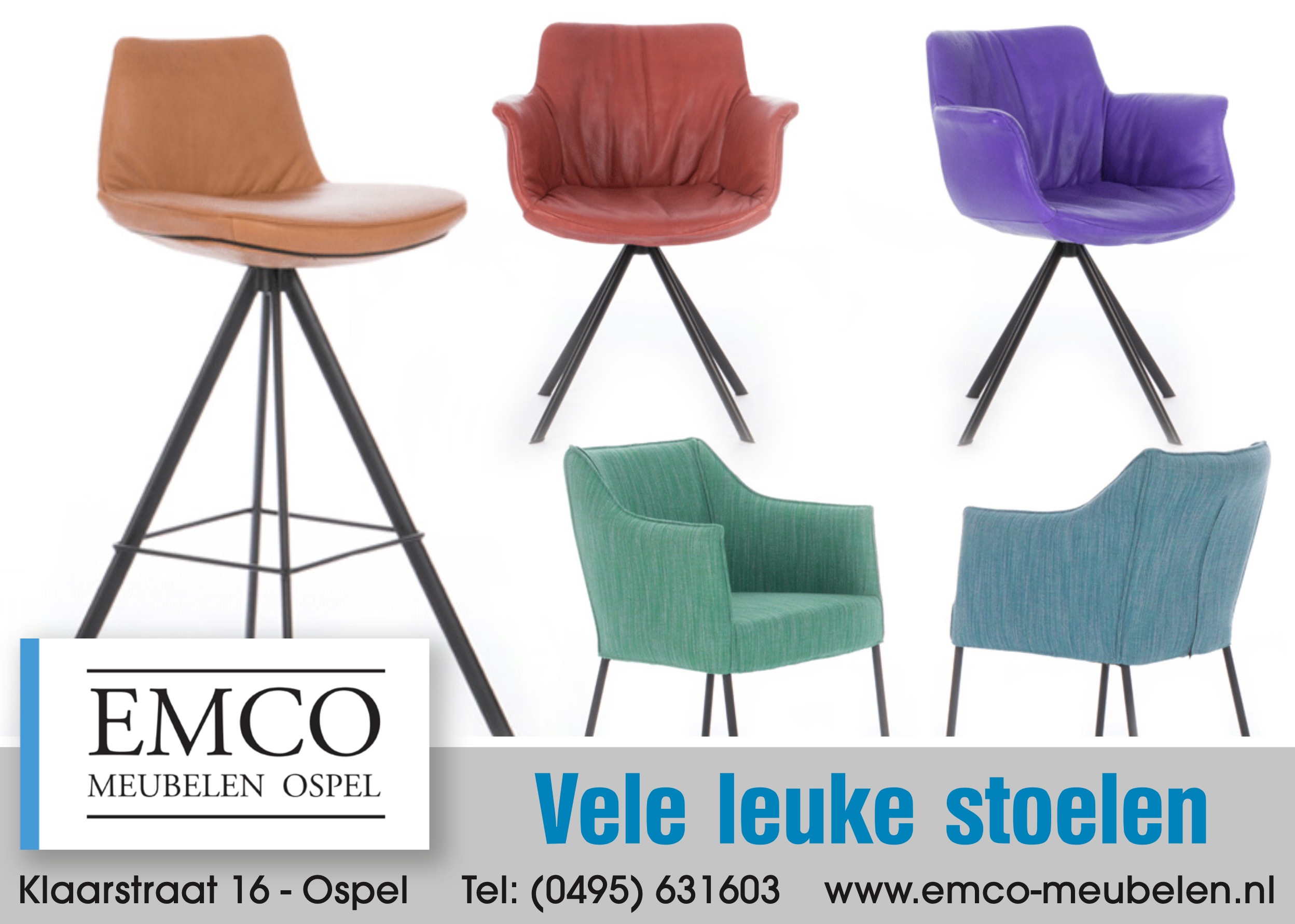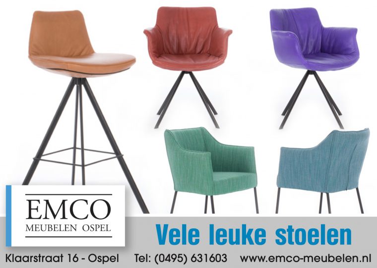 De beurzen zijn weer geweest en ze hebben bij Emco Meubelen daar leuke nieuwe stoelen gekocht. Volgens de laatste trend mag je weer kleur gaan bekennen. Hoe fris en anders is je woning met een set leuk gekleurde stoelen? Kom je overtuigen van de mooie kleuren in stof en leder.