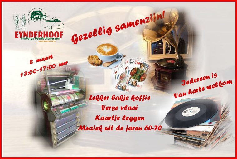 De herberg van het openluchtmuseum Eynderhoof is op zondag 8 maart open van 13.00 uur tot 17.00 uur. Daar is dan discjocky Jan Salimans aanwezig die plaatjes draait uit de tijd van de jukebox.