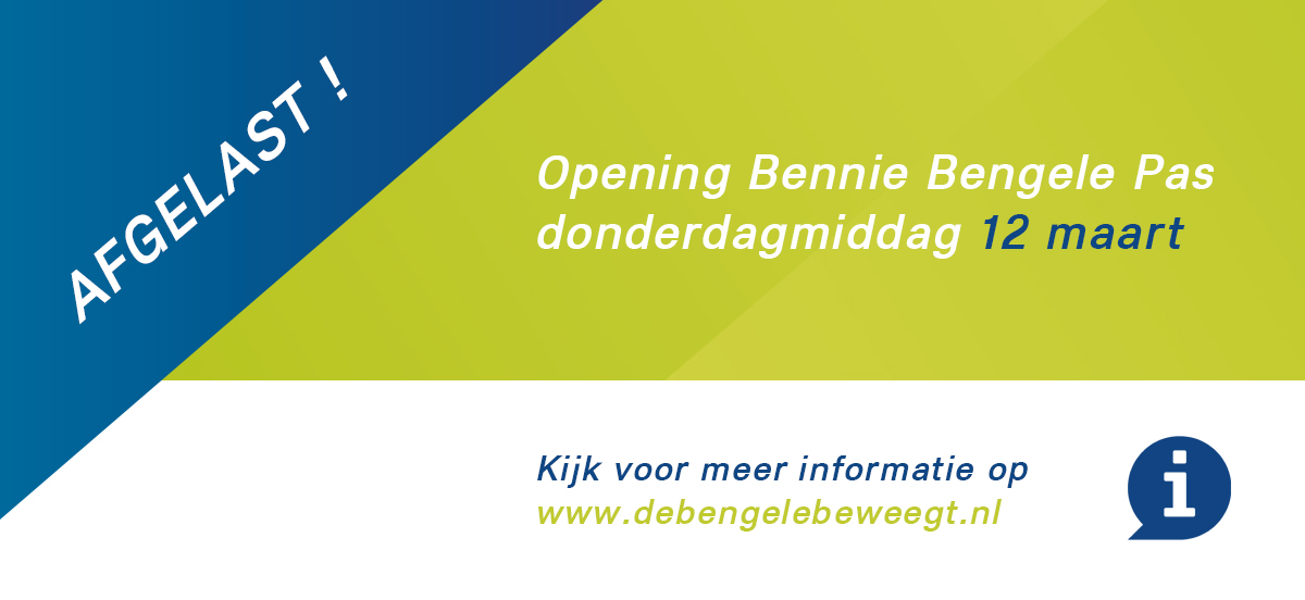 Bengele Beweegt is positief verast door de vele enthousiaste reacties omtrent de opening van de Bennie Bengele Pas. Gezien de ontwikkelingen rondom de corona-uitbraak heeft het bestuur van stichting de Bengele Beweegt echter het openingsevent op donderdagmiddag 12 maart helaas moeten annuleren.