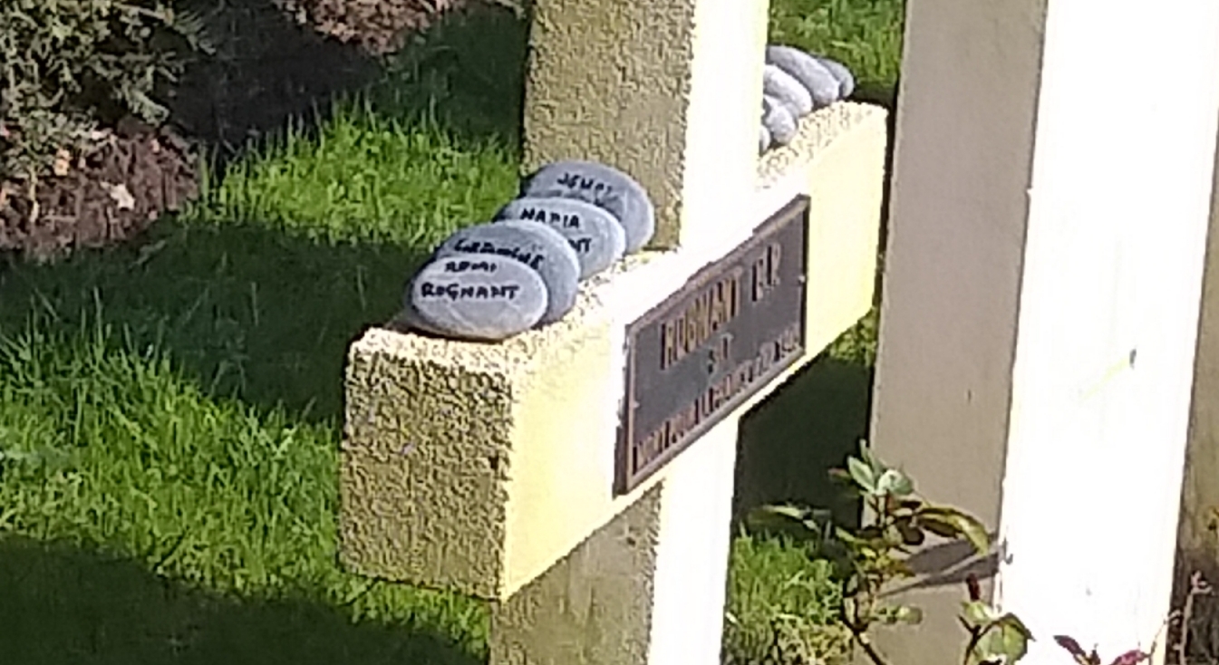 Met het ‘breaking news’ van de resultaten van het Nederweertse onderzoek op zak, hebben diverse familieleden van Rognant uit Frankrijk onlangs het graf in Zwartbroek bezocht. In de vorm van kiezelstenen met daarop hun namen hebben zij hun bezoek en herdenking vereeuwigd. Rognant was niet alleen ‘Mort pour la France’, maar eigenlijk gevallen voor ons allemaal. En dat kunnen we ons, ook in deze barre tijden, niet vaak genoeg realiseren.