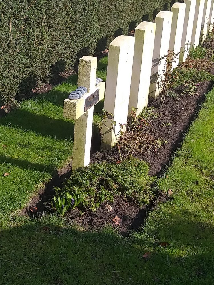 Waarschijnlijk hebben familieleden het graf van Vliegenier Rognant op zn. 75e sterfdag 7 Feb. 2020 bezocht, getuige de namen op de steentjes. Mooi geschreven.