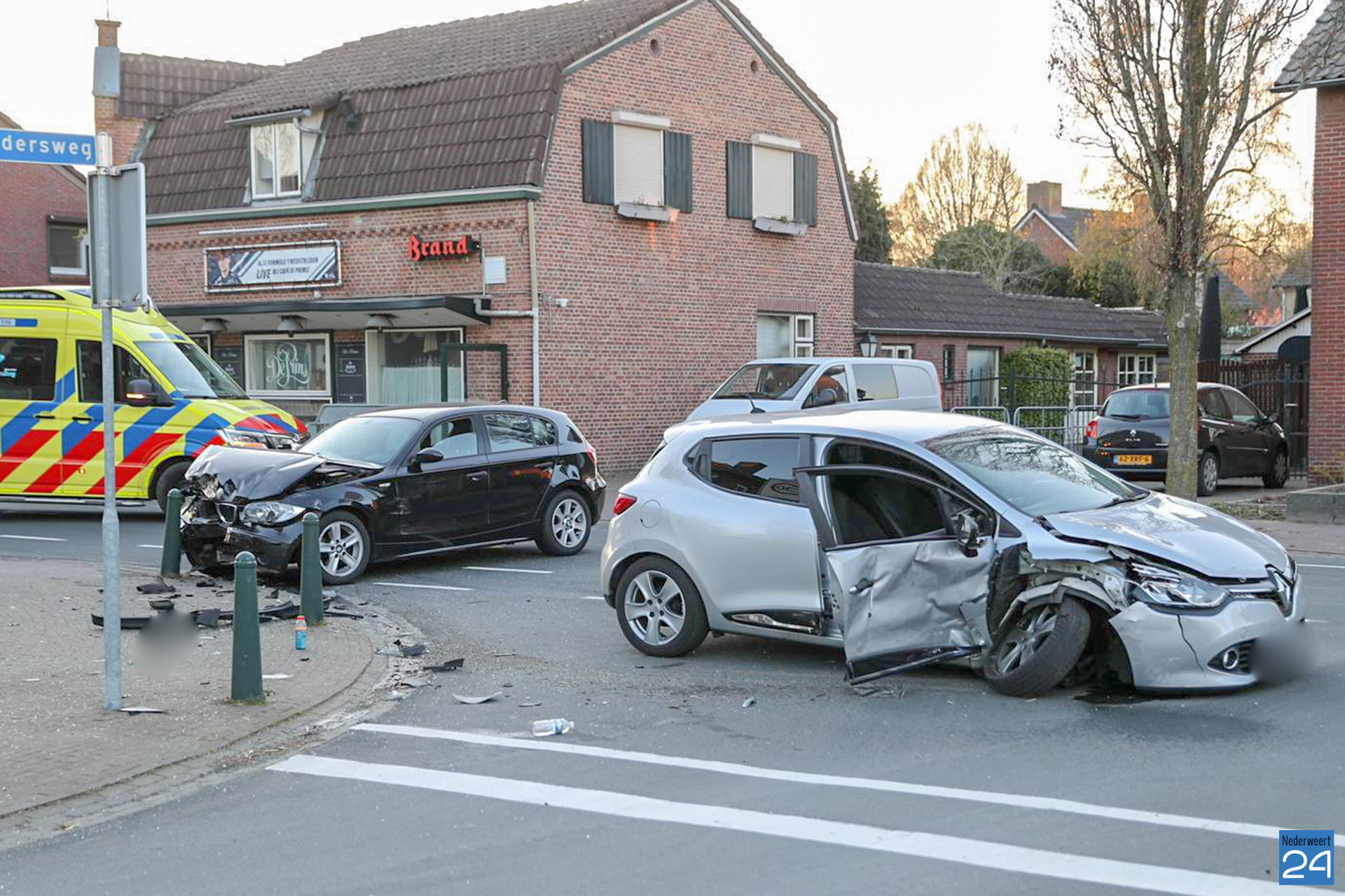 Bij het Aerthijsplein zijn brokstukken aangetroffen. Daar is ook te zien dat een paaltje flink beschadigd is geraakt. Het is nog niet bekend of één van de betrokkenen hier tegenaan is gebotst.