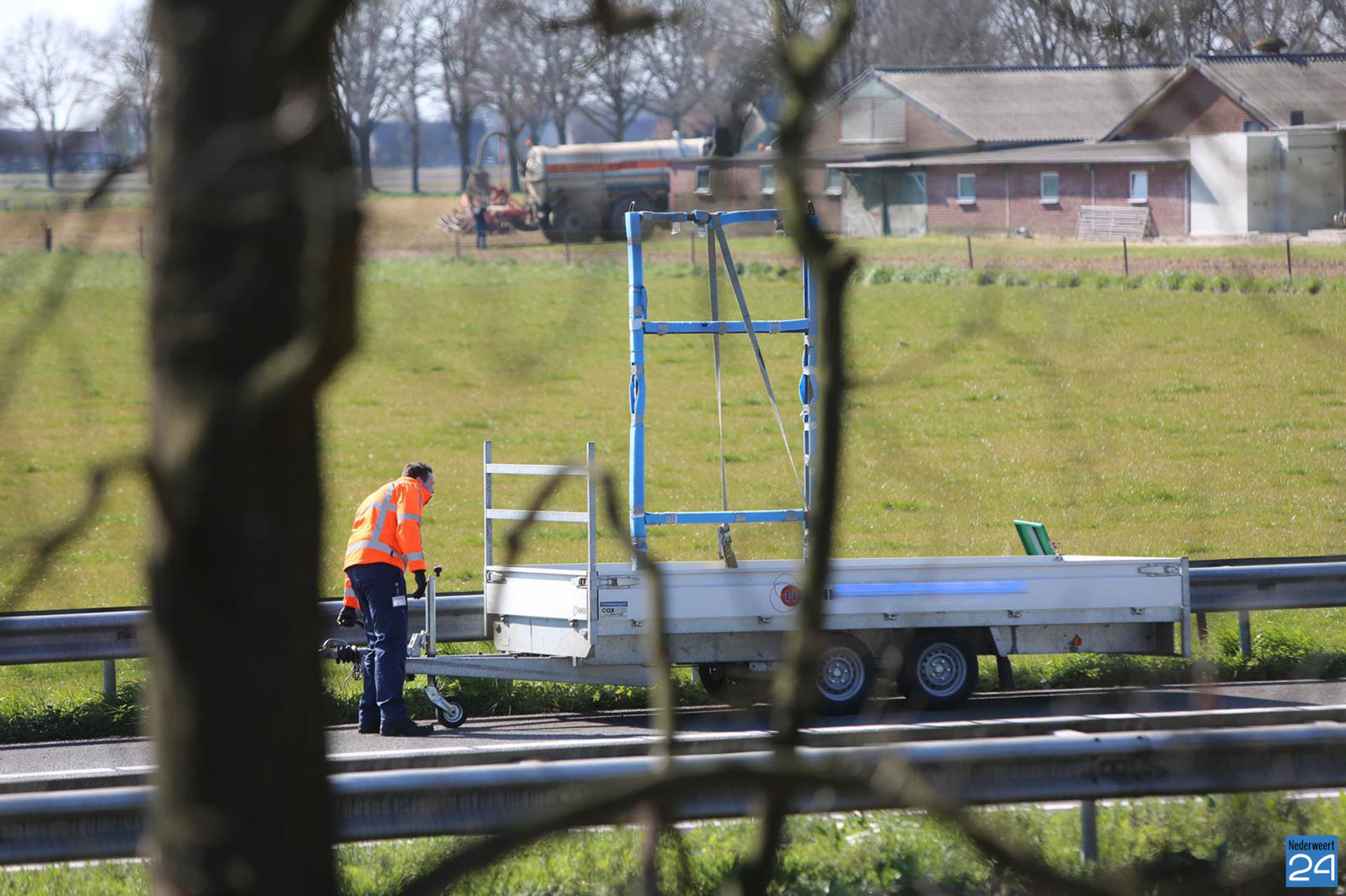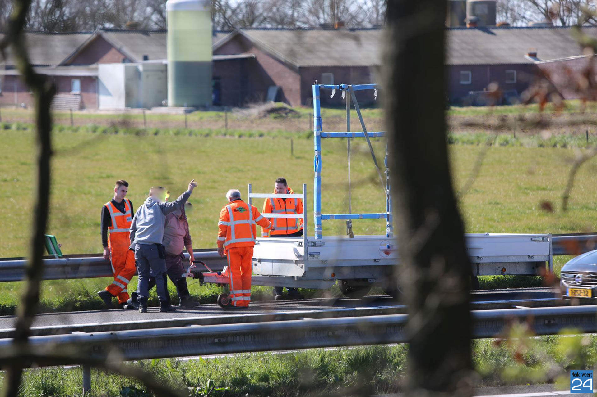De aanhangwagen schoot los en kwam in de middenberm terecht. De bestuurder, welke van achter werd aangereden, raakte gewond en is per ambulance overgebracht naar het ziekenhuis.