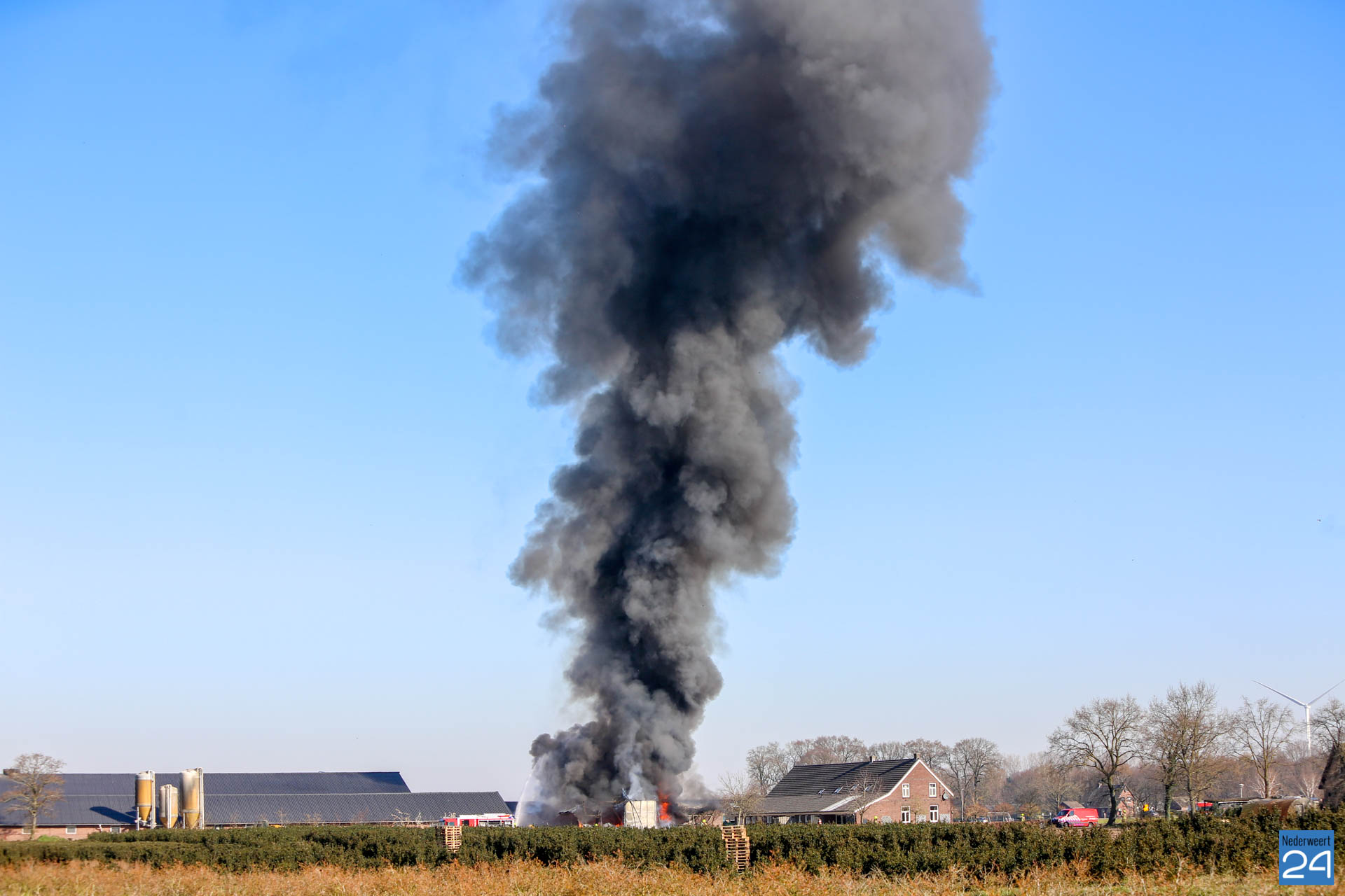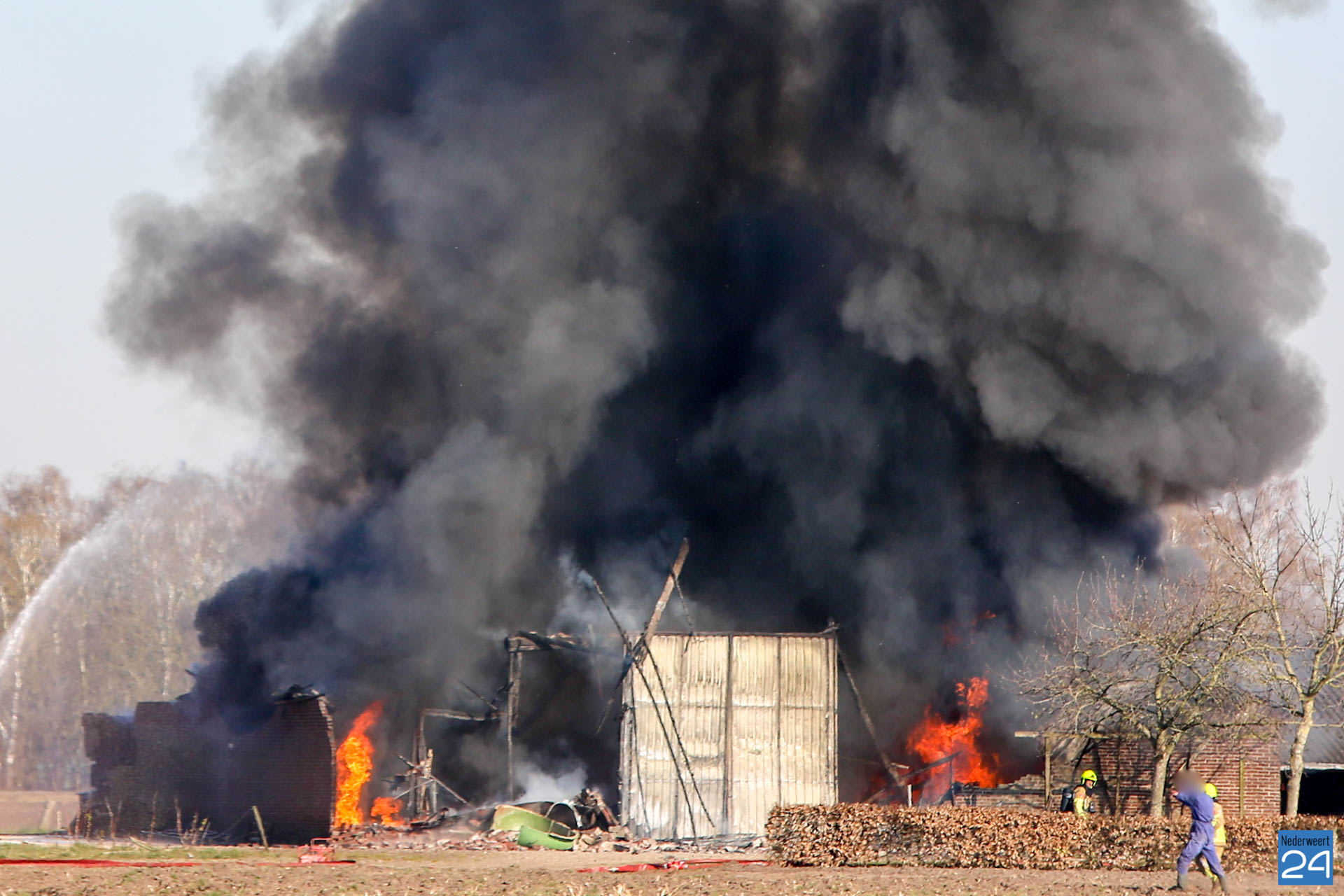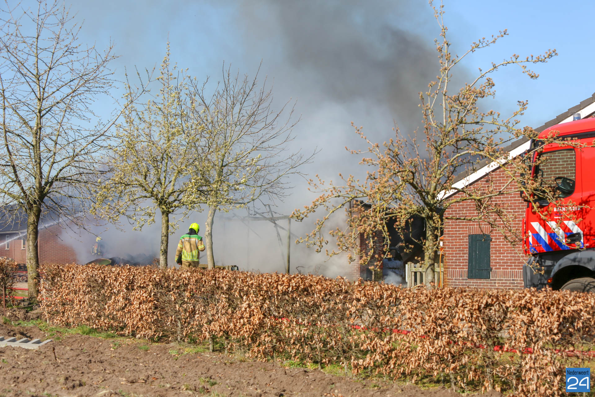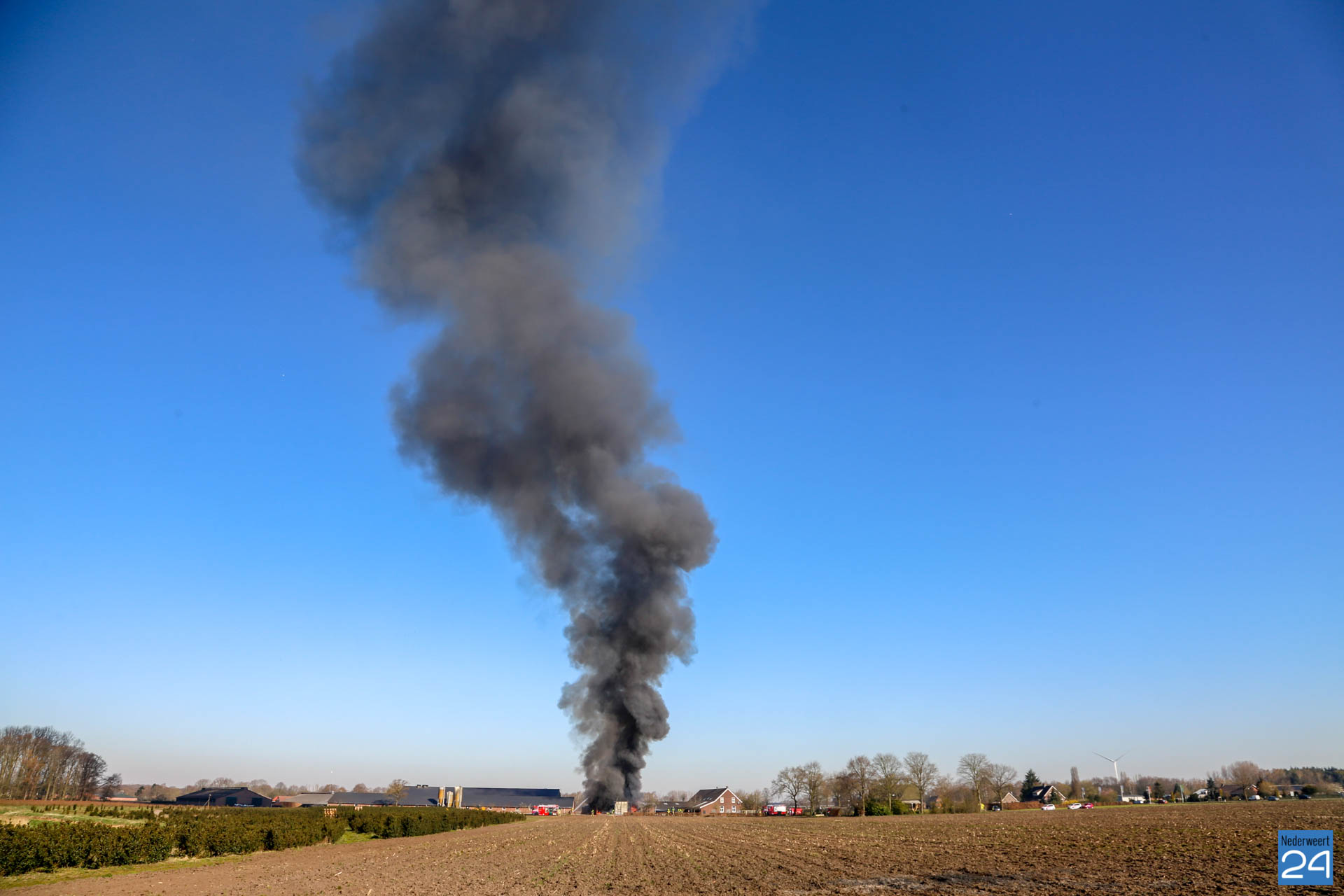 Er is geen asbest vrijgekomen bij de brand. De rook trekt laag over de grond richting Roggel. Daar zijn twee meetploegen aanwezig.
