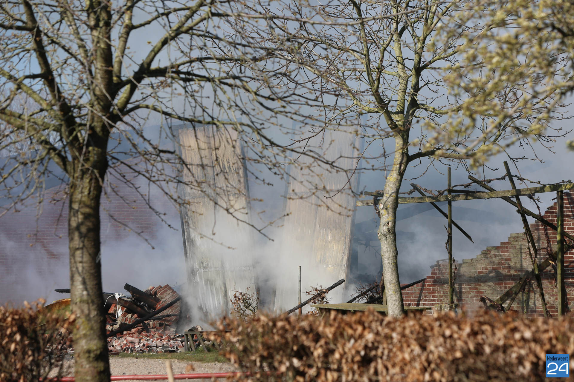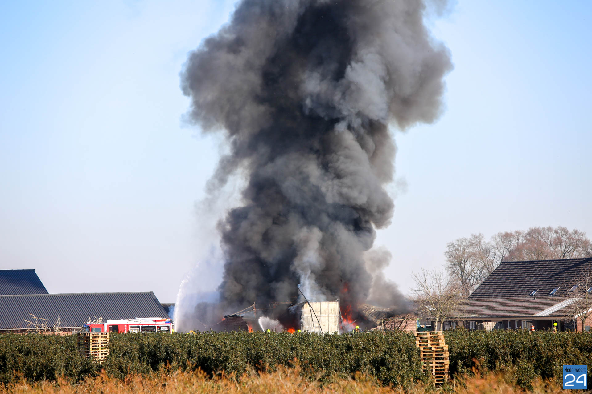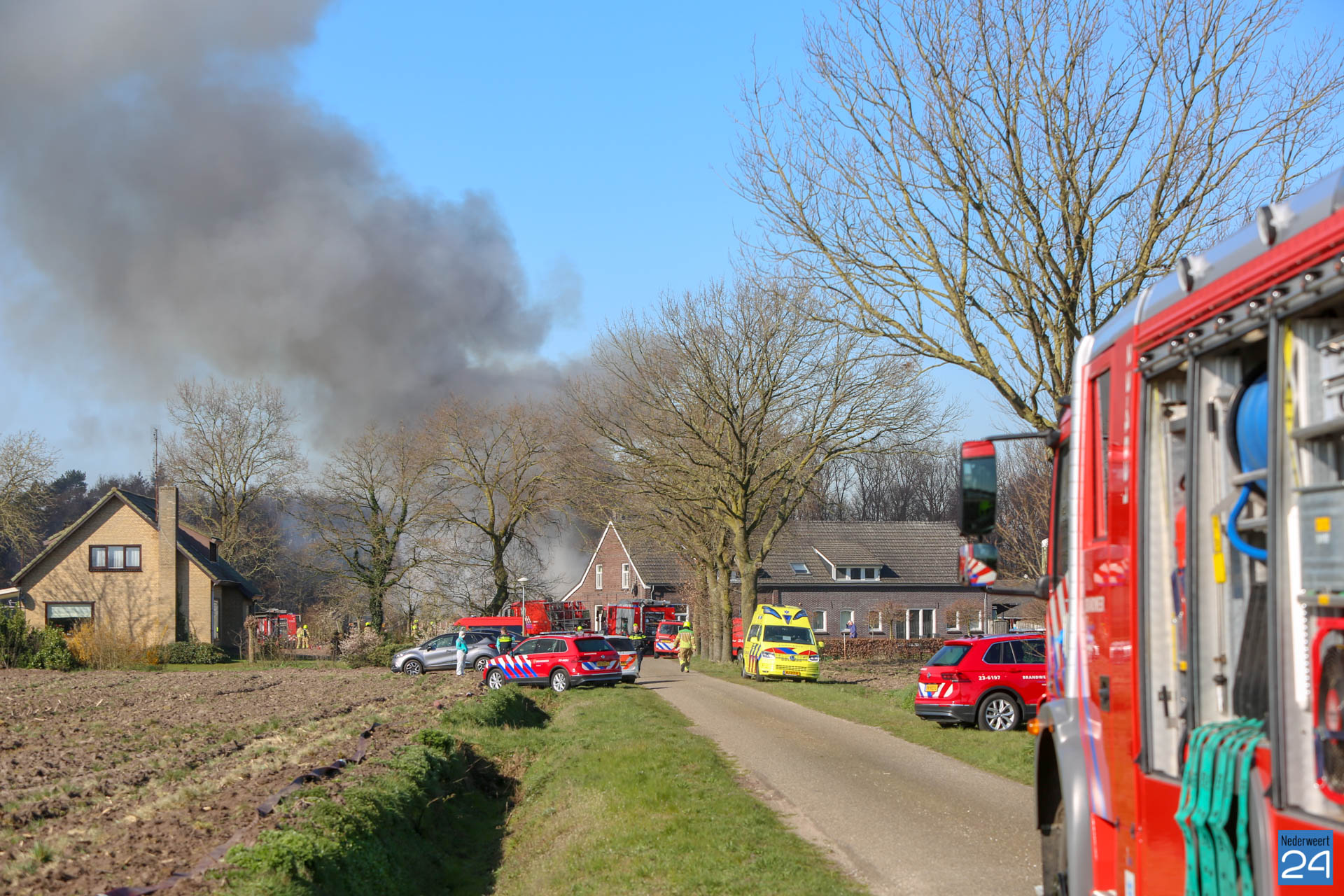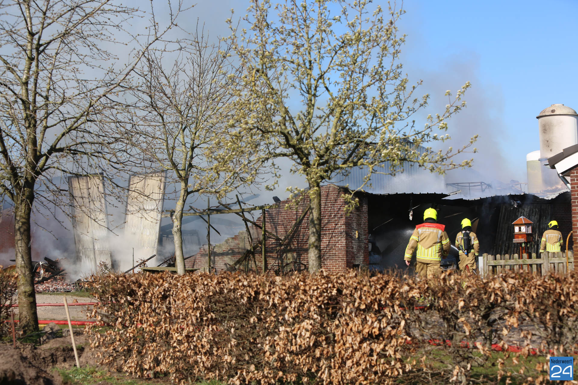Er is geen asbest vrijgekomen bij de brand. De rook trekt laag over de grond richting Roggel. Daar zijn twee meetploegen aanwezig.