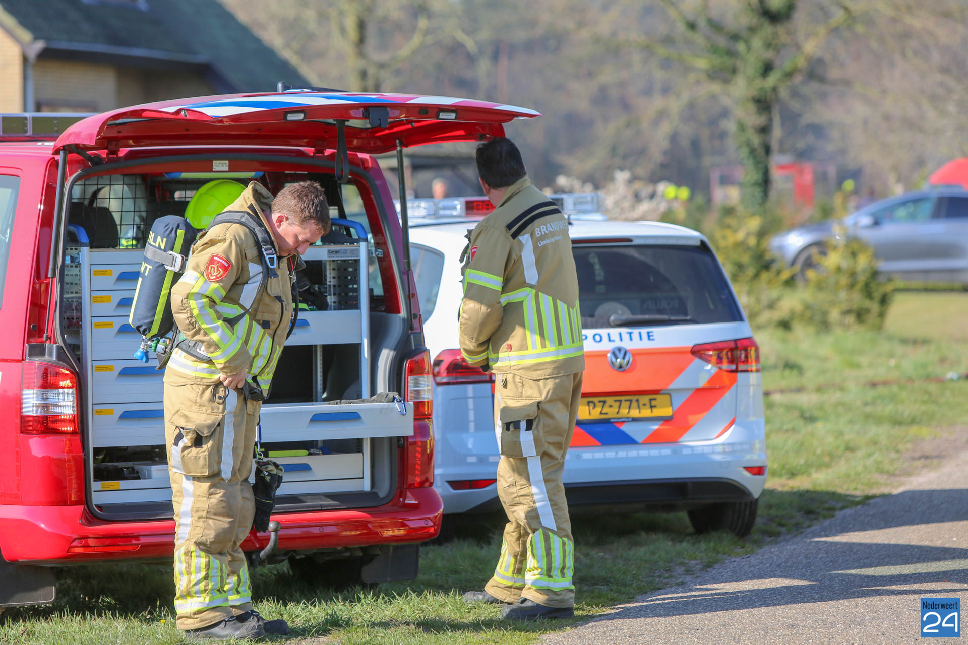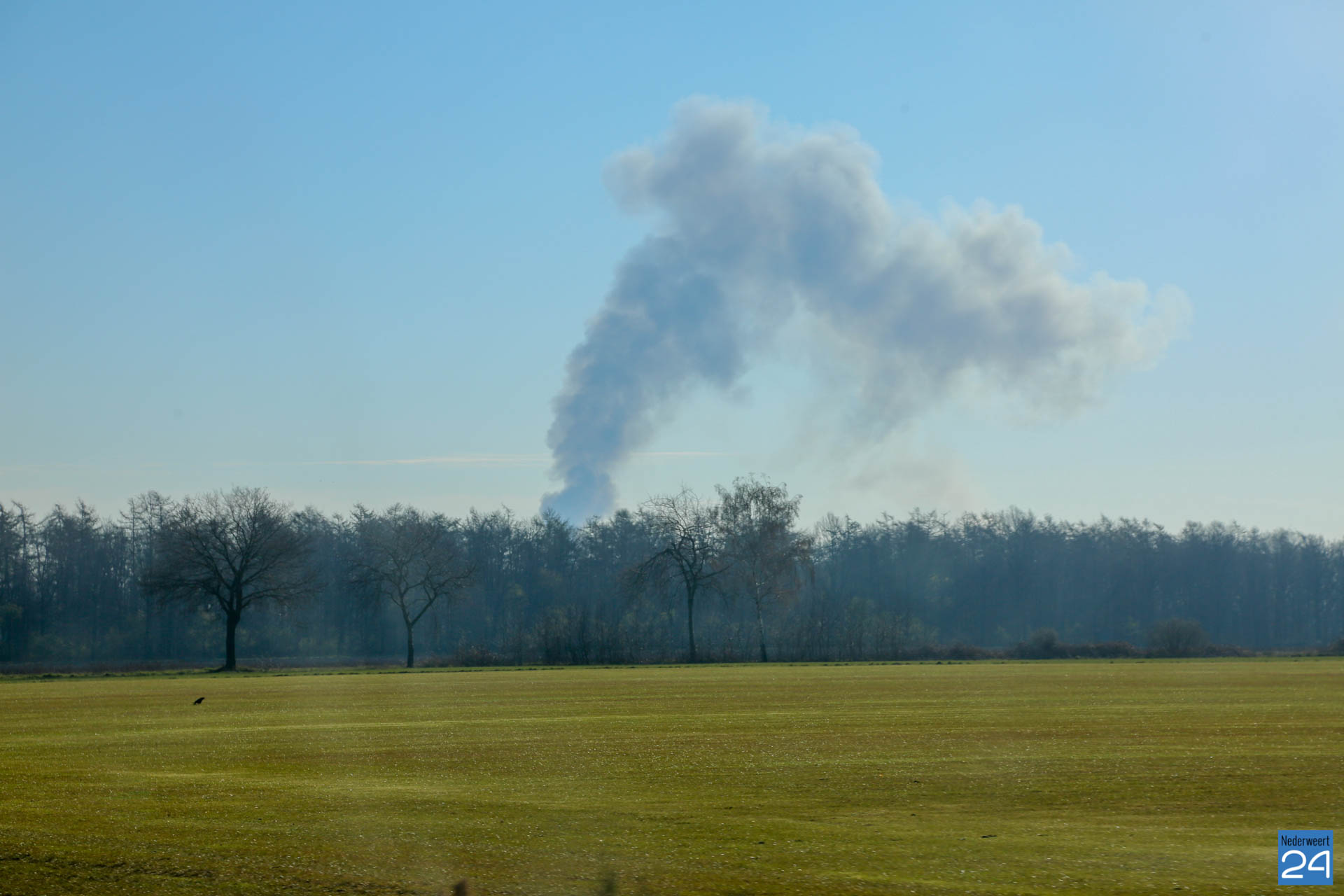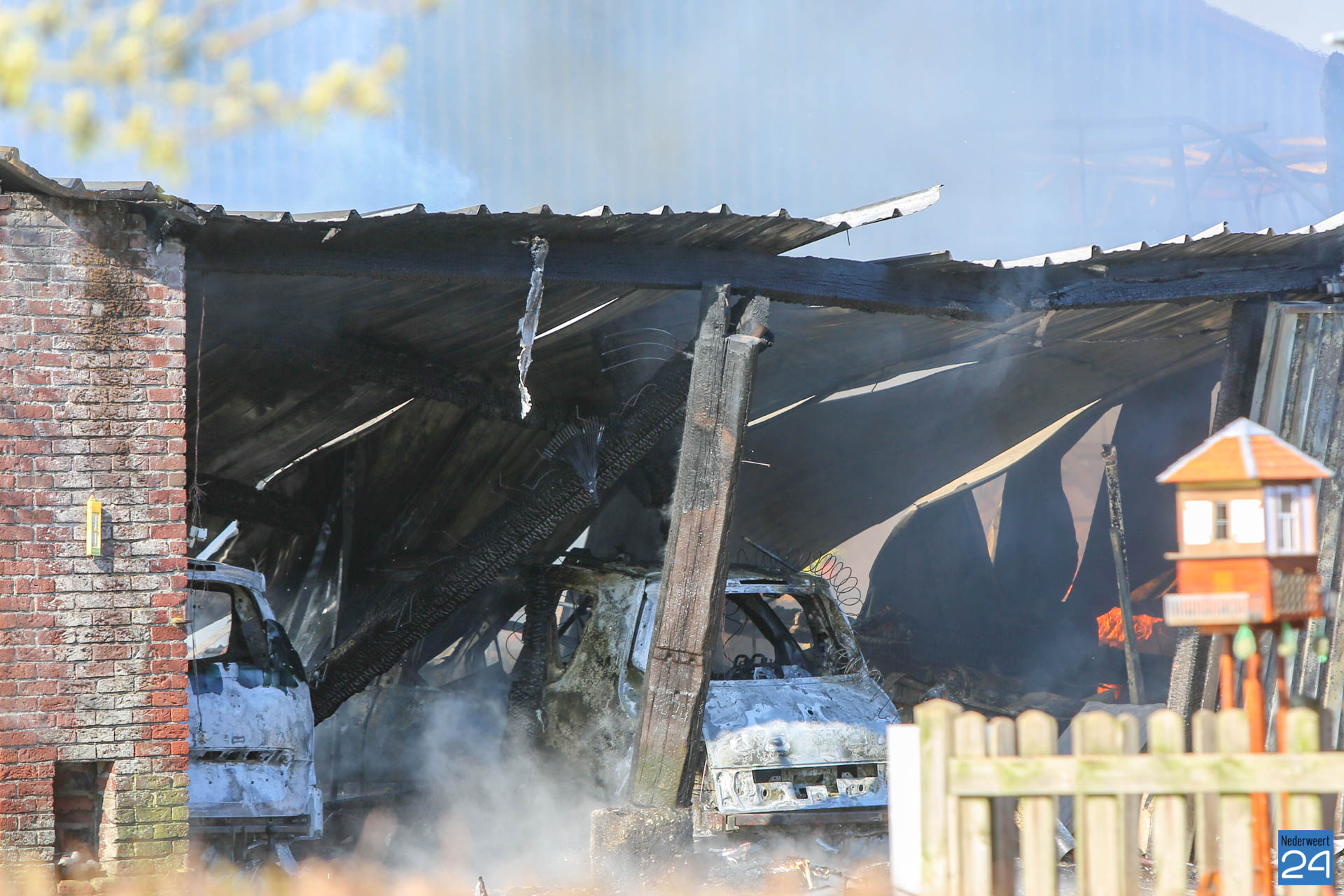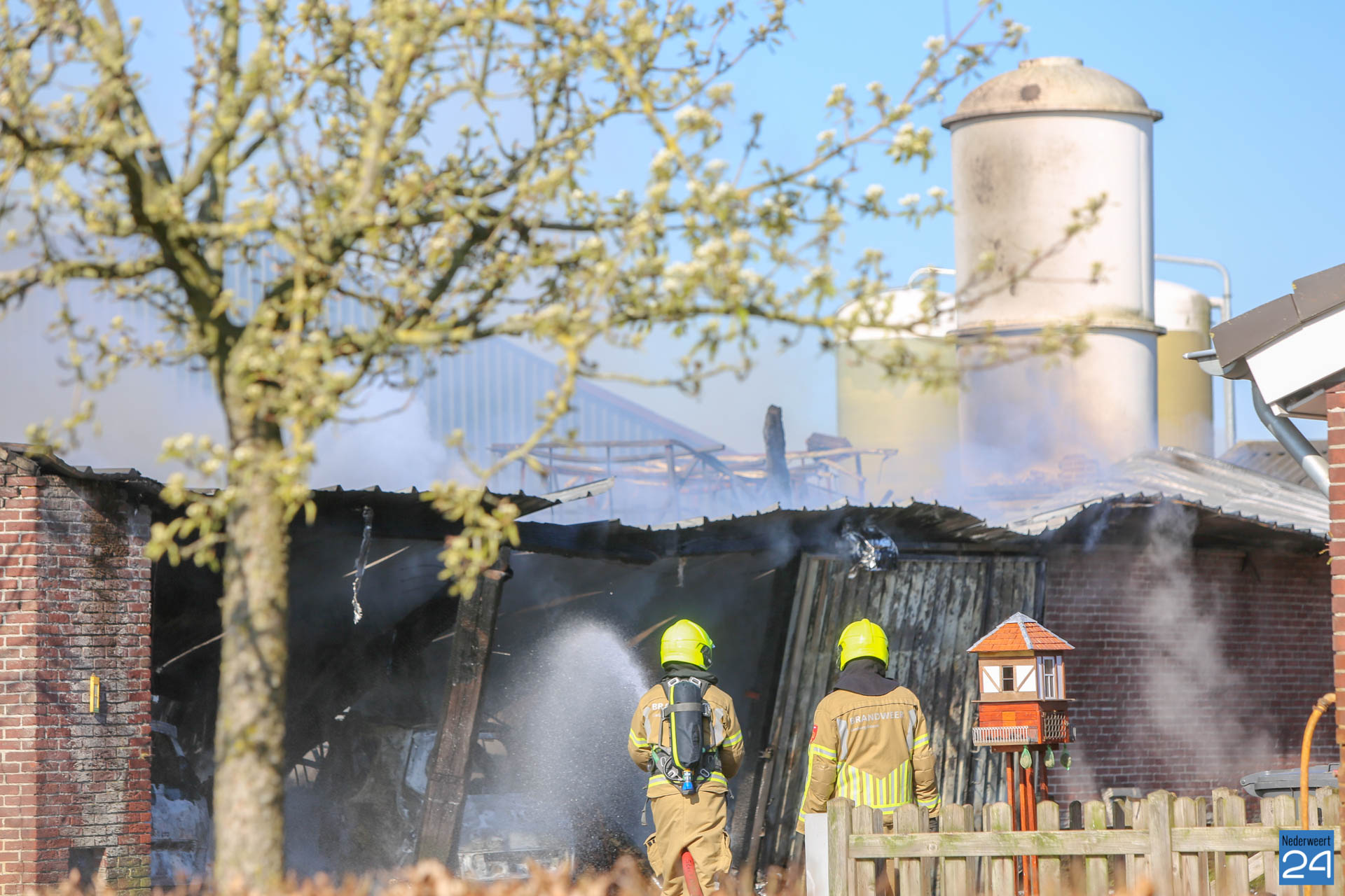 Er is geen asbest vrijgekomen bij de brand. De rook trekt laag over de grond richting Roggel. Daar zijn twee meetploegen aanwezig.