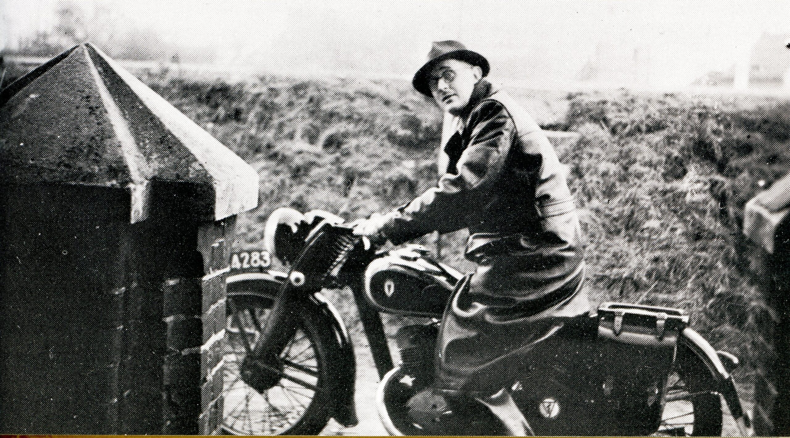 Huisarts dokter Wim Jansen (1910-1993), een van de pioniers van de moderne gezondheidszorg in Nederweert, op zijn motorfiets op weg naar een patiënt.