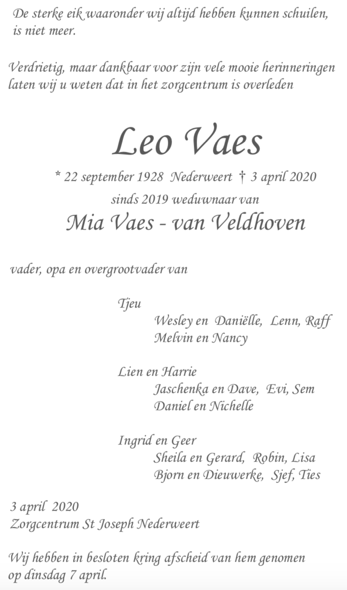 Kinderen Vaes en familie sterkte toegewenst met het verlies van pap, opa, overgrootvader.