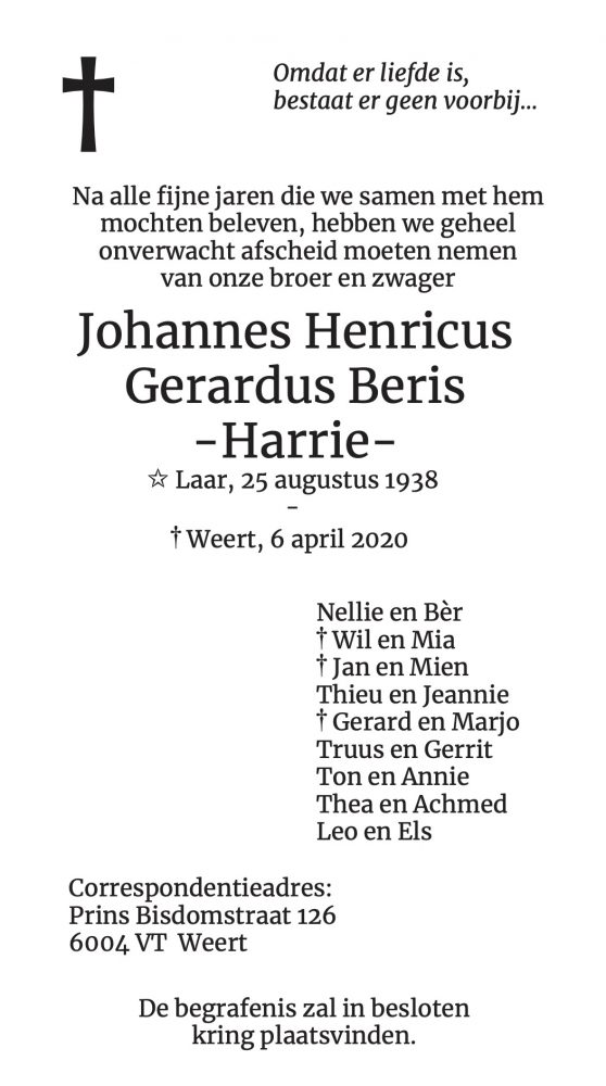 Overlijdensbericht: Johannes Henricus Gerardus Beris -Harrie-