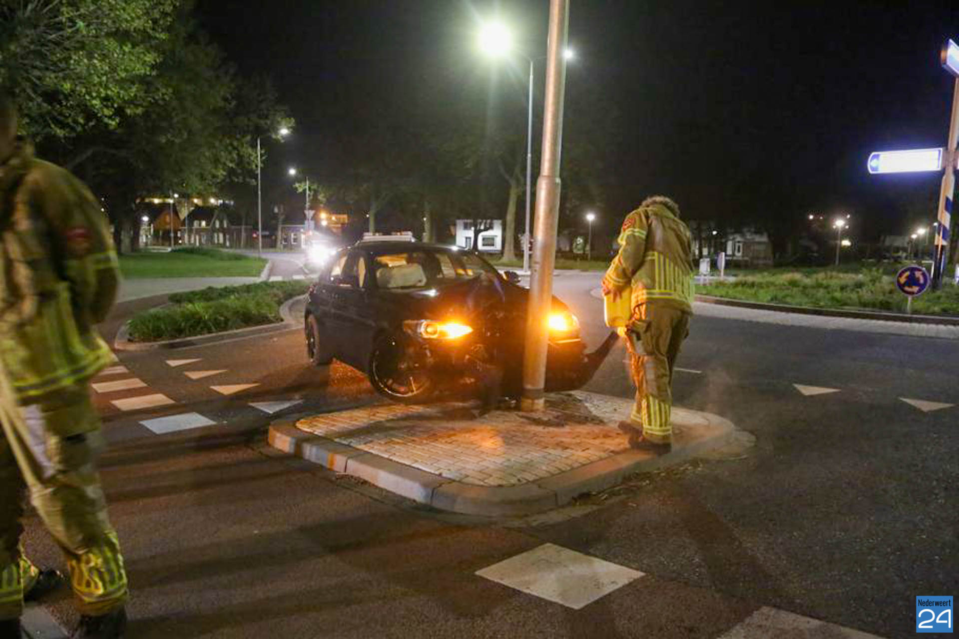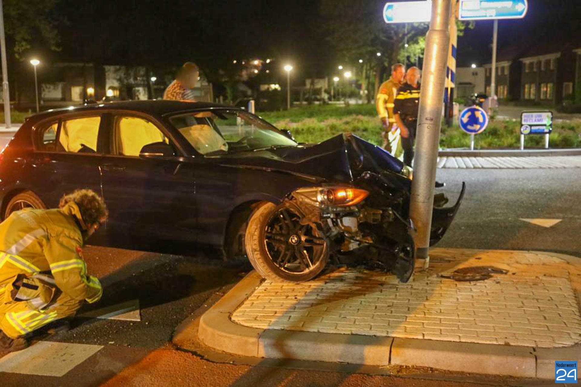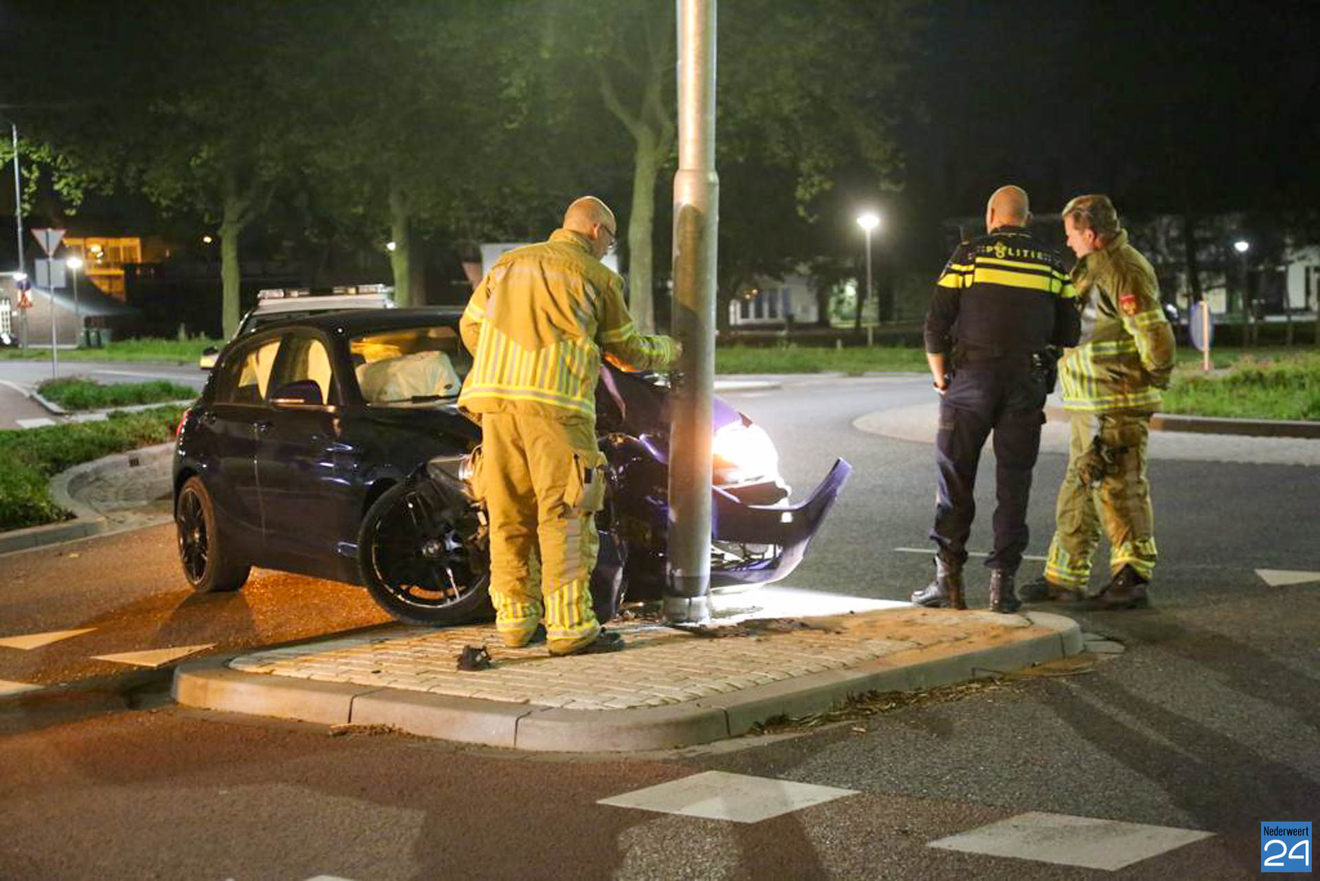 Woensdagavond rond kwart voor twaalf is een personenauto hard tegen een lantaarnpaal gebotst op de rotonde Sint Maartenslaan met de Maaseikerweg in Weert.