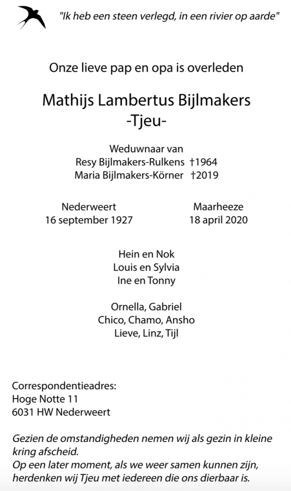 Overlijdensbericht: Tjeu Bijlmakers