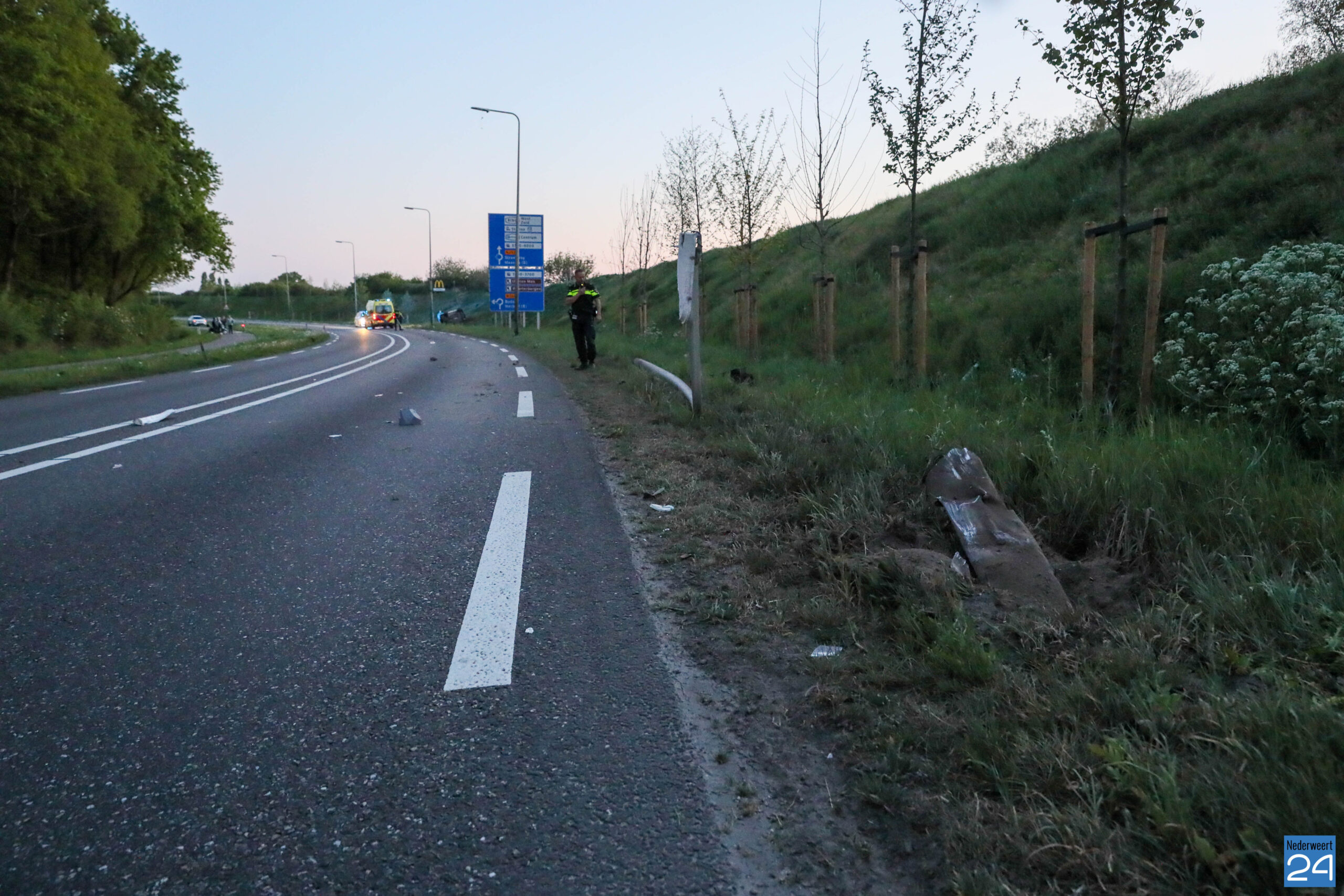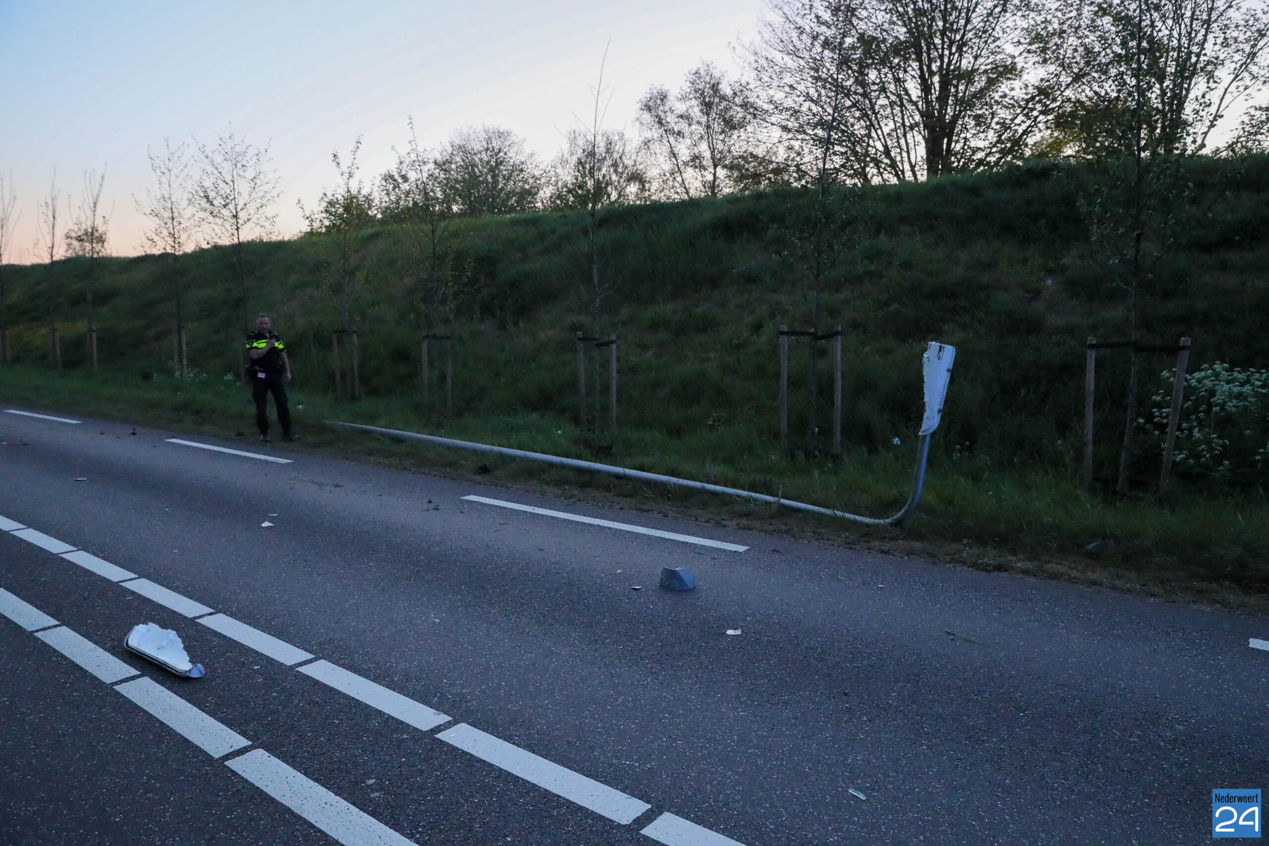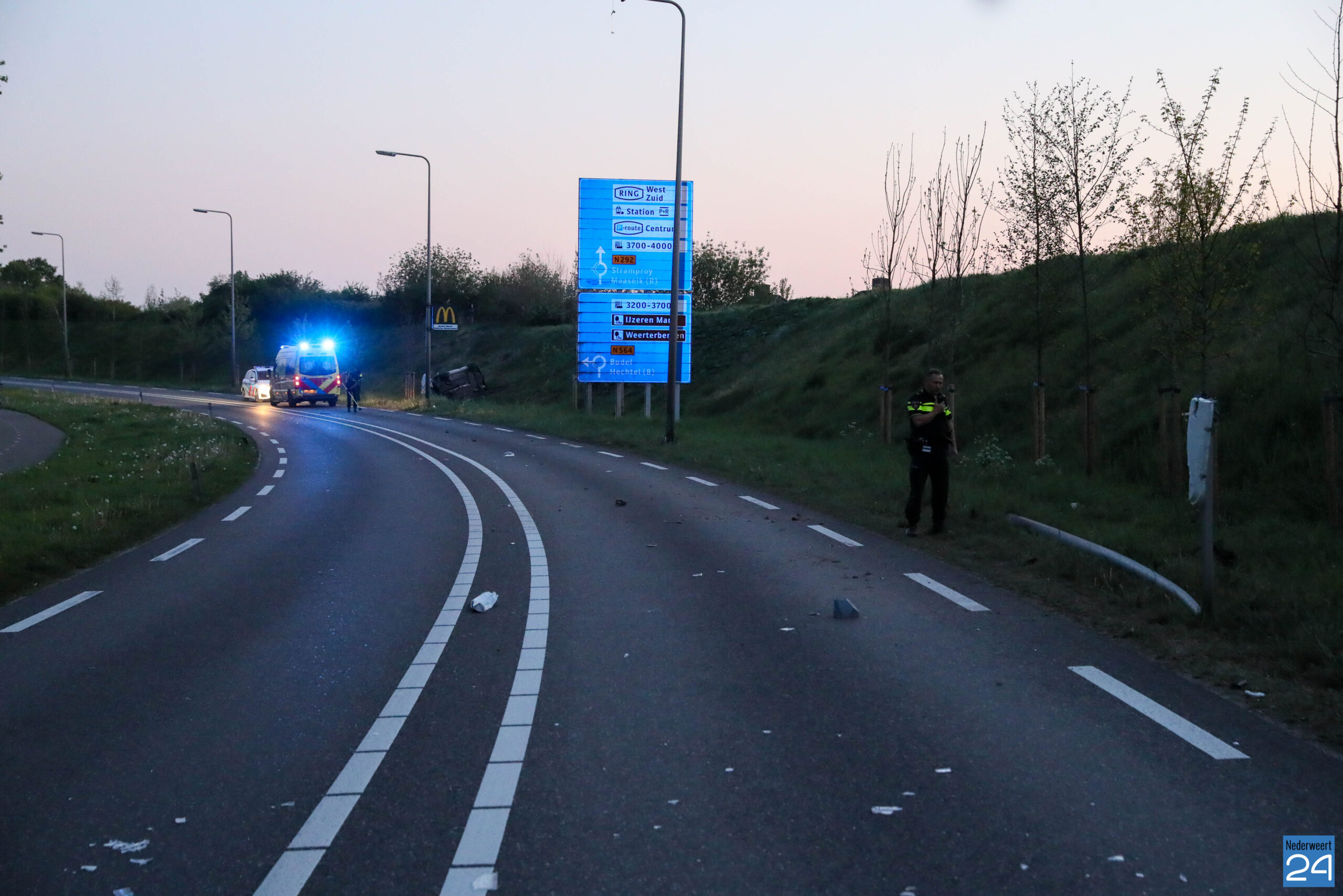 De weg is tijdelijk afgelosten voor het verkeer. De gemeente Weert wordt in kennis gesteld van de ravage. Een veegwagen zal de weg schoonwegen.