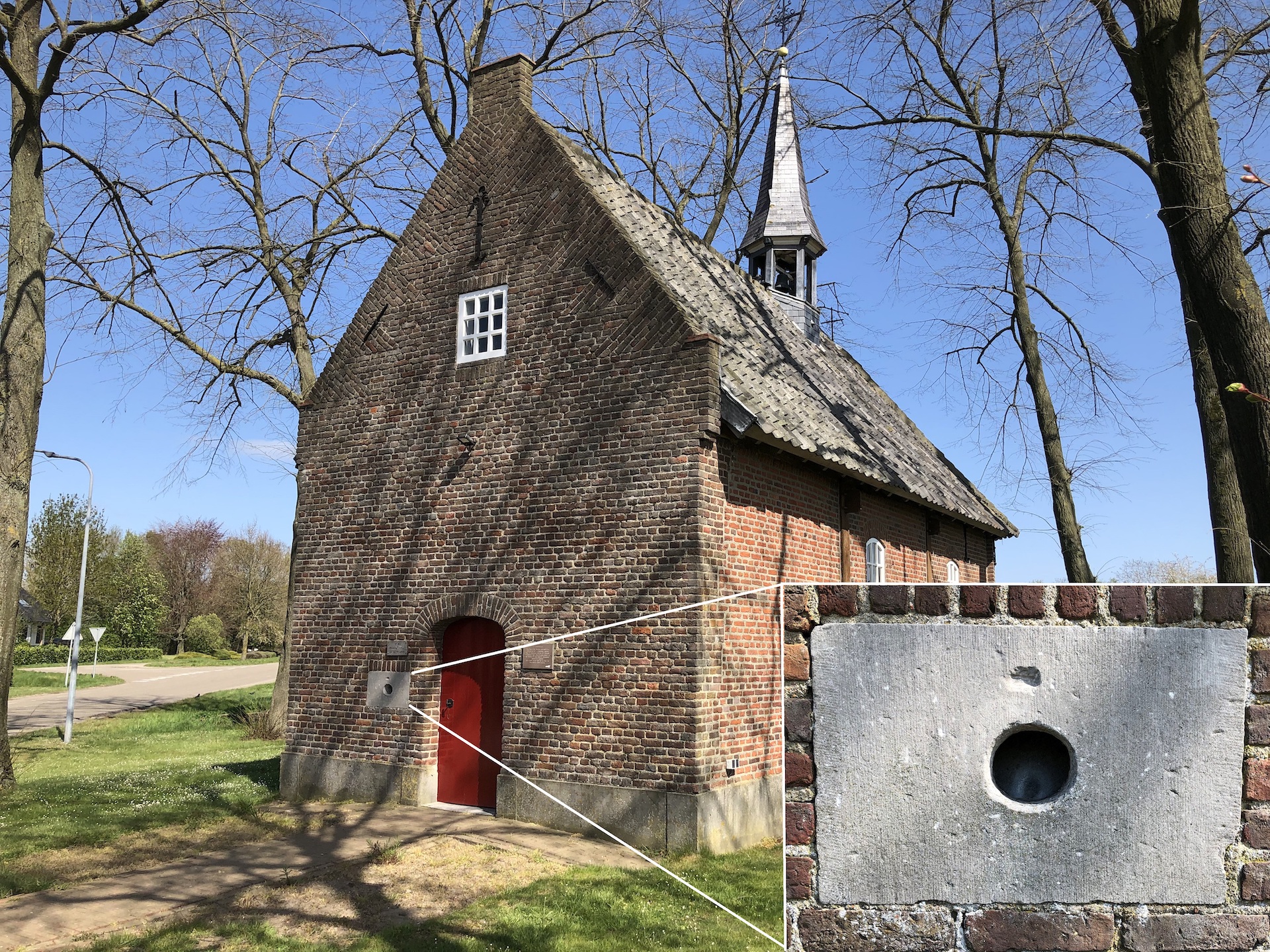 De Sint Sebastiaanskapel van Laar op de grens van Weert en Nederweert heeft nog een fraai kijkgat of ‘hagioscoop’. Door dat gat mochten lepralijders ondanks het toegangsverbod toch een blik op het altaar werpen. Maar wel op de knieën. Social distancing is van alle tijden. Foto: Alfons Bruekers.