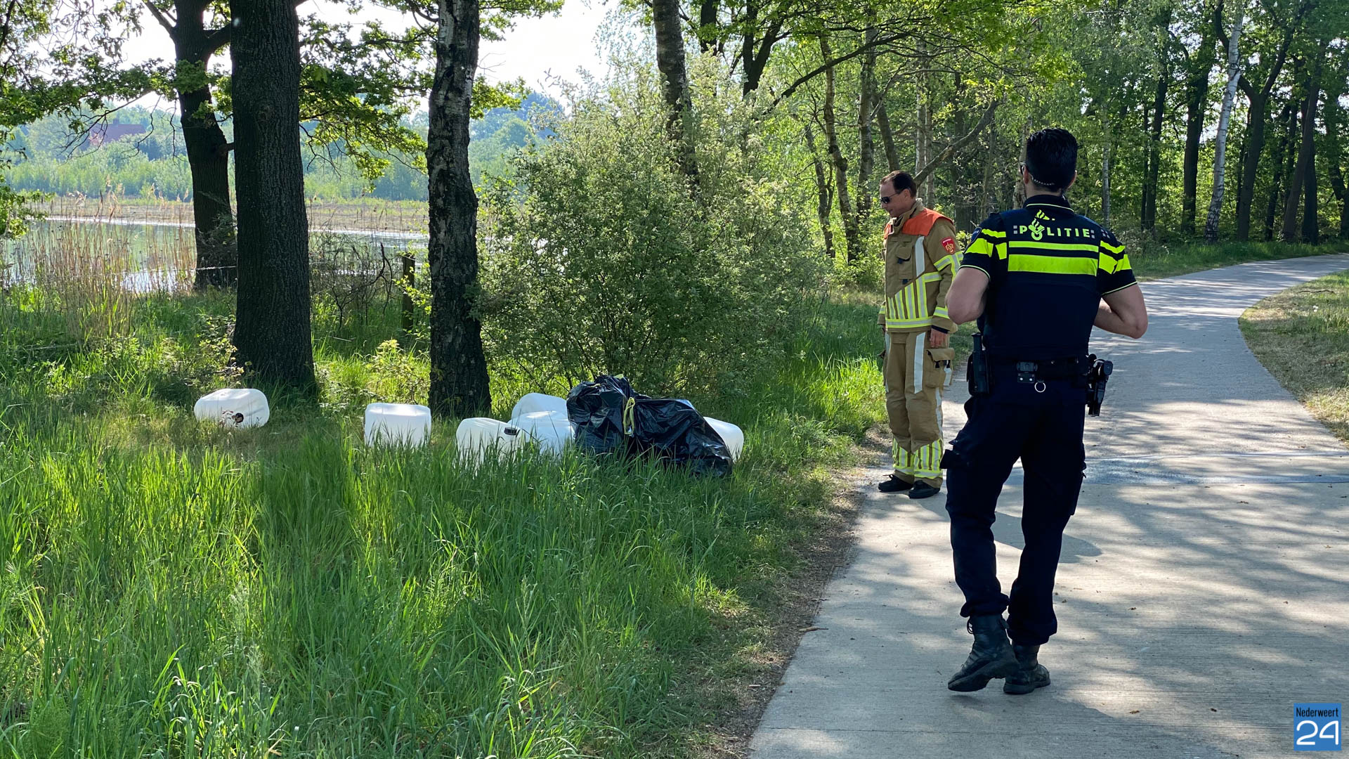 Maandagmorgen heeft een voorbijganger een melding gedaan van gedumpte jerrycans aan de Schoordijk in Nederweert.