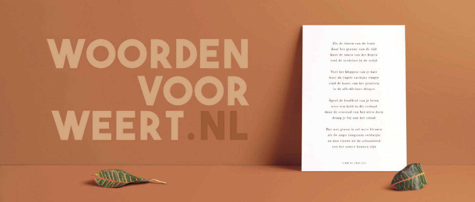 ‘Woorden voor Weert. Een hart onder de riem voor Weert en een ode aan ons zorgpersoneel.’ Dat is de naam van een initiatief van Charlotte Verkeyn van CMR Rijmpjes. Samen met verschillende ondernemers en Weertenaren zette ze dit initiatief op. Het concept? Een uniek, op maat geschreven, troostend rijmpje voor Weert tijdens de Corona crisis. Inwoners van Weert en omliggende kerkdorpen kunnen de tekst bestellen op een poster of een ansichtkaart. Door de poster aan te schaffen en achter het raam te hangen, kunnen Weertenaren hun solidariteit met de zorg tonen. De ansichtkaart is ideaal om te versturen naar een dierbare die we moeten missen in deze moeilijke tijd. De opbrengst van het initiatief wordt geschonken aan het zorgpersoneel van het SJG en Land van Horne. Charlotte Verkeyn: “Poëzie is een steun in eenzaamheid, het biedt troost en brengt mensen samen: zeker in deze bizarre tijden waarin veel mensen het gevoel hebben machteloos aan de zijlijn te staan.”