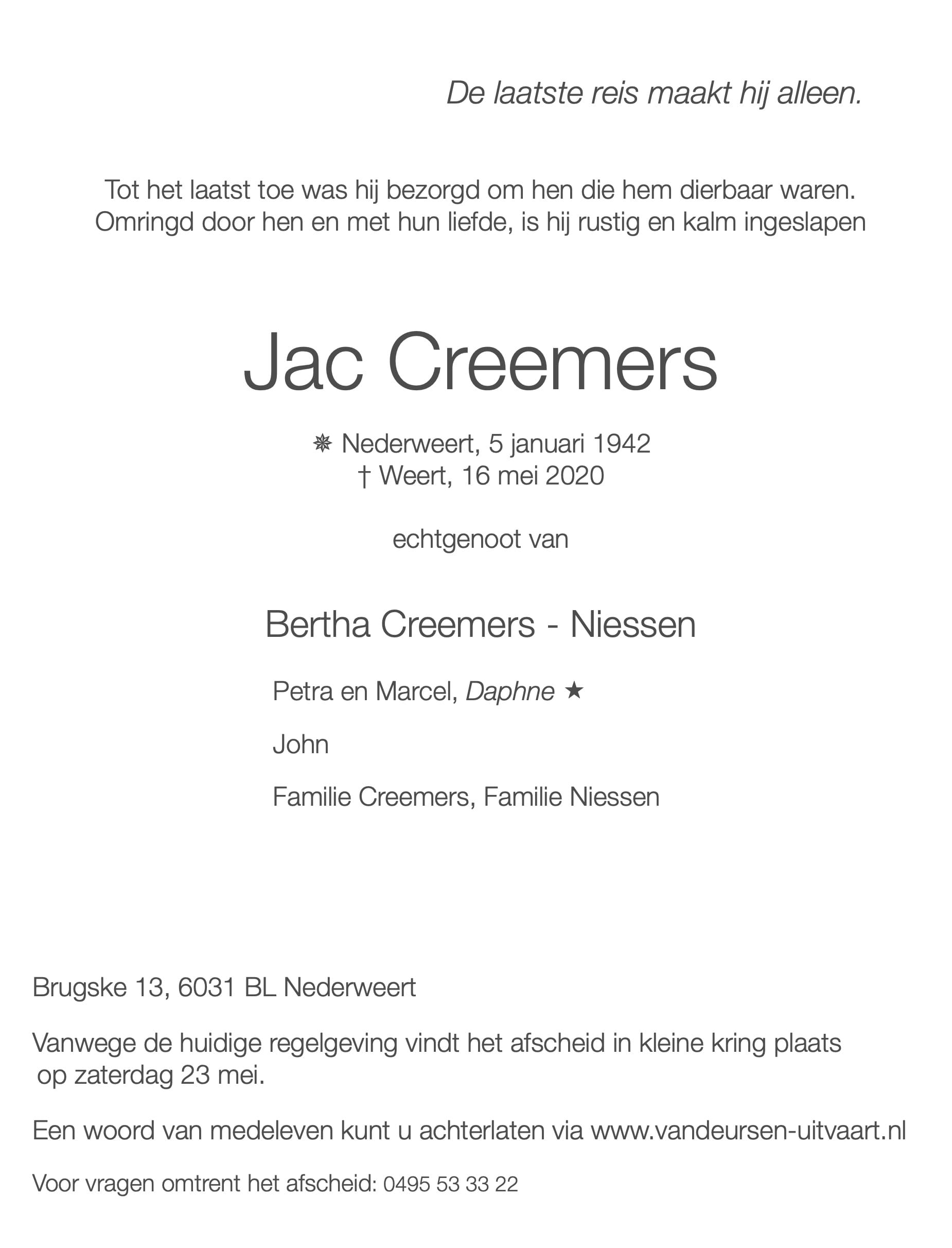 Overlijdensbericht: Jac Creemers