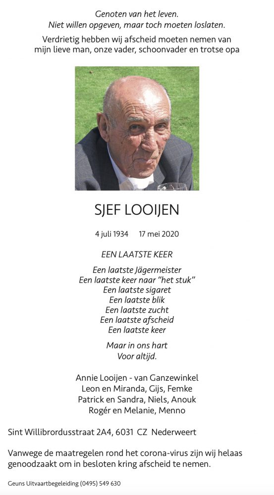 Fam. Looijen gecondoleerd met het overlijden van echtgenoot. Vader, Schoonvader Opa en onze Ome Sjef. Wij wensen jullie heel veel sterkte in deze moeilijke tijd