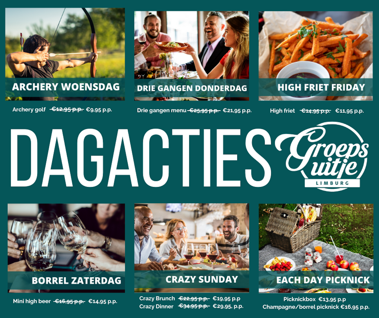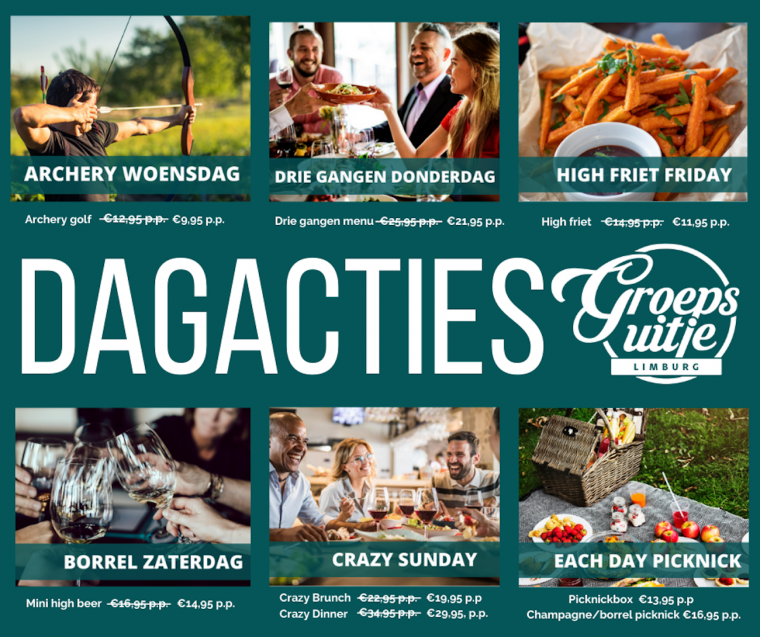 Het aftellen is begonnen! Vanaf 1 juni zijn ze bij Groepsuitje Limburg weer geopend! Uiteraard zoals altijd met de leukste activiteiten, maar daarnaast ook als restaurant & terras. Ze zijn standaard geopend van woensdag t/m zondag. Kun je niet wachten? Zoek dan alvast je favoriete gerecht uit. De lunch- en dinerkaart staat vanaf vandaag op de website. En ook reserveren kan gemakkelijk online!