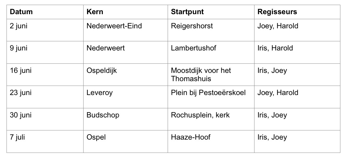 Voordat de regisseurs leefbaarheid een ronde door het dorp gaan lopen, is het mogelijk om hen aan te spreken bij het startpunt tot 13:15 uur. Na het “Nederweerts kwartiertje” zullen de regisseurs om 13:15 uur een ronde maken door het dorp en in gesprek gaan met de inwoners. Schroom niet om op gepaste afstand een praatje met ze te maken. Zij horen graag wat er op dit moment speelt en leeft bij u in de buurt.