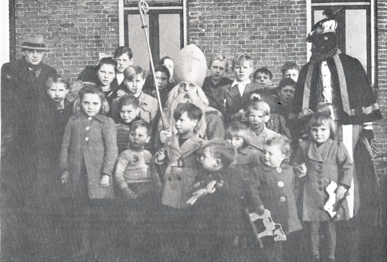 Sinterklaasviering op de school in de Moost. De foto is uit het begin van de jaren ’40, dus in oorlogstijd. De stand-in van Sinterklaas is Louis Rulkens en zijn assistent met het donkere gelaat is gemeente-ambtenaar Jozef Kessels. Meester van den Heuvel staat geheel links op de foto, naast zijn leerlingen. De allerkleinsten op de foto waren nog geen leerling maar wel uitgenodigd bij dit Sinterklaasfeestje. Foto: archief SGN.