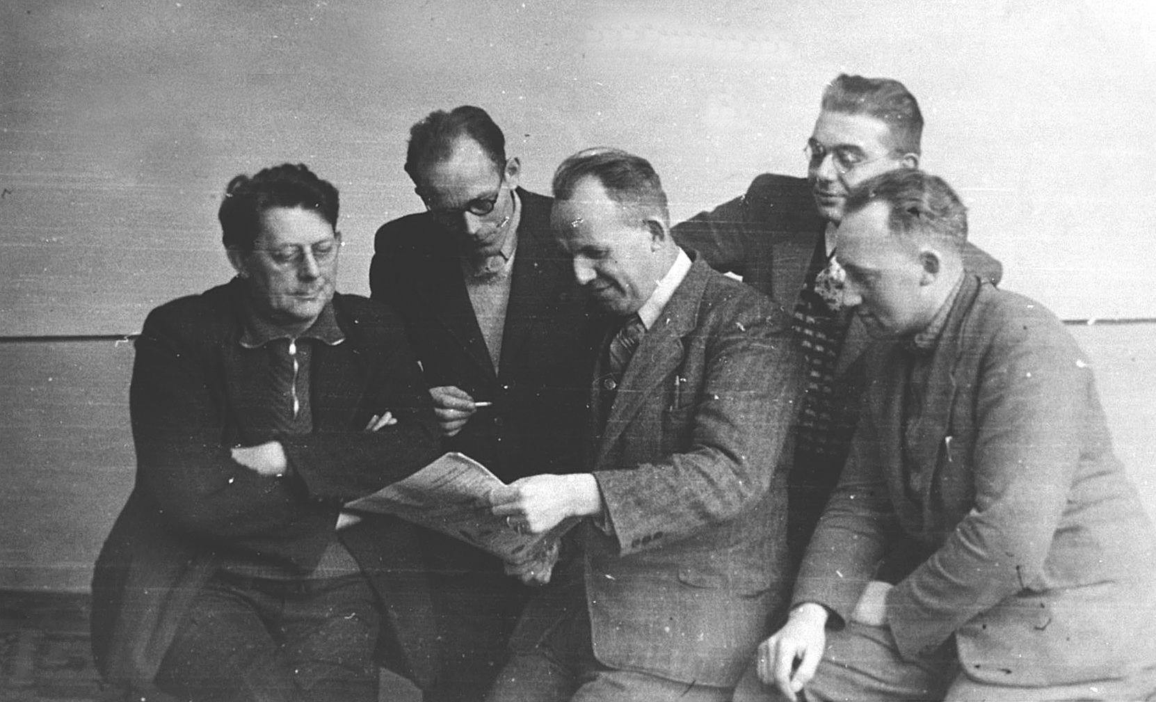 Onderwijzers uit Ospel gingen in december 1946 op de foto. Van links naar rechts de meesters Körner, Peters, Koppen, Van den Heuvel (rechtsboven) en Westerveen (rechtsonder). Foto: Doospel Vreuger