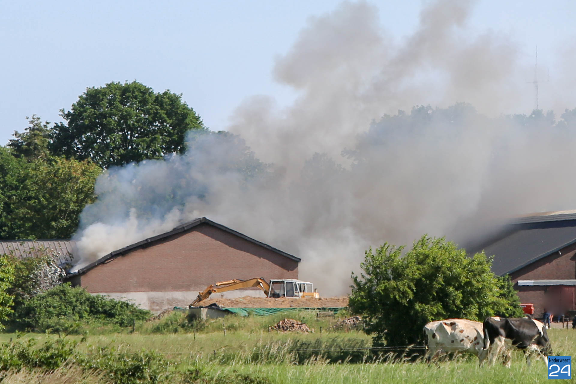 Het hooi is uit de stal gereden en vervolgens afgeblust. De stal raakte flink beschadigd door de brand.