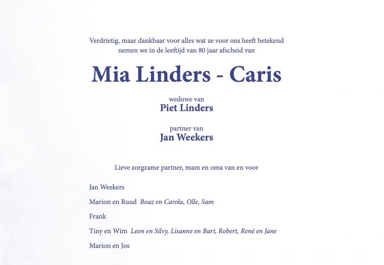 Overlijdensbericht: Mia Linders – Caris