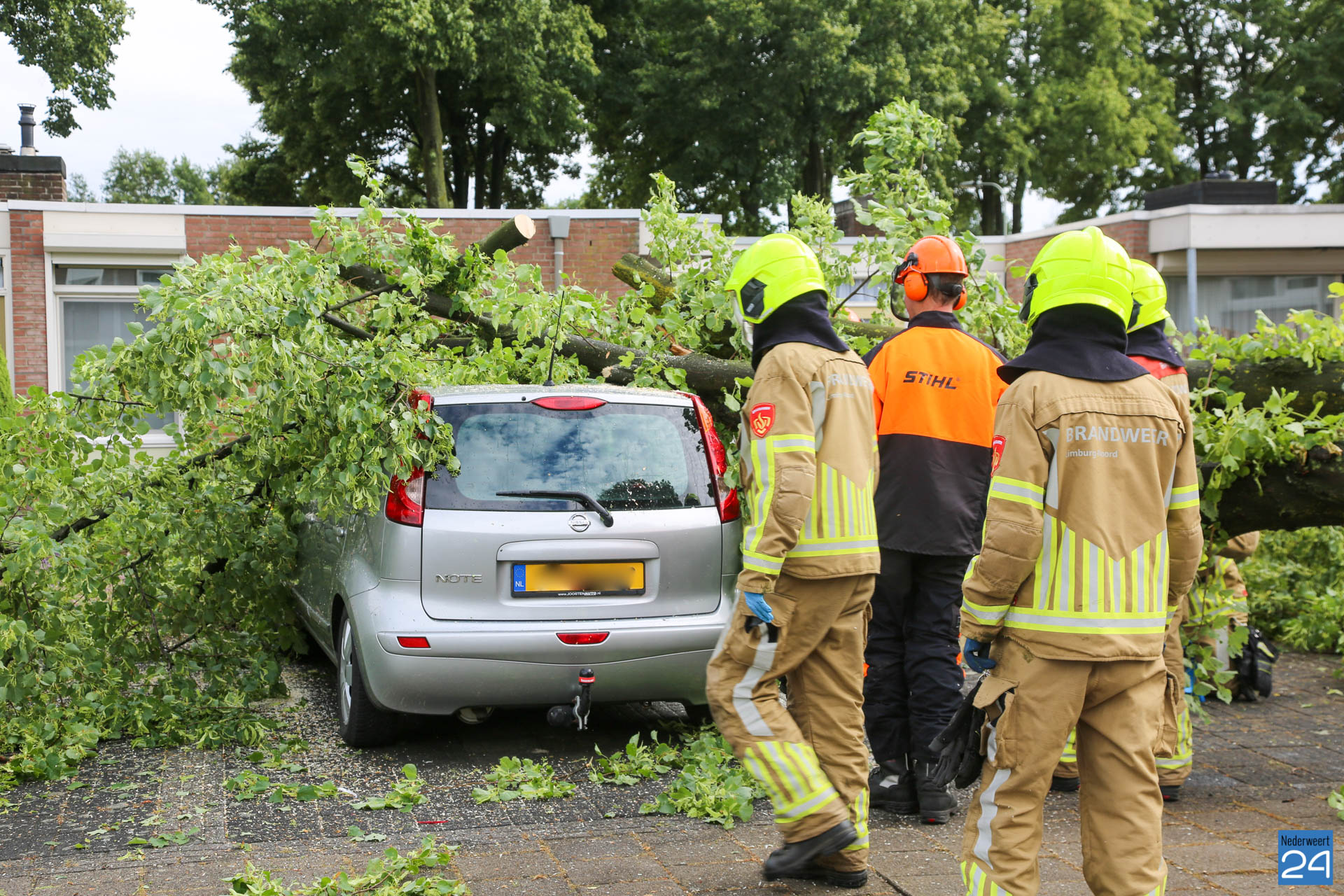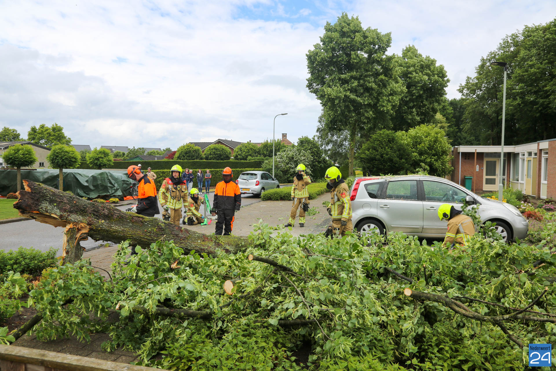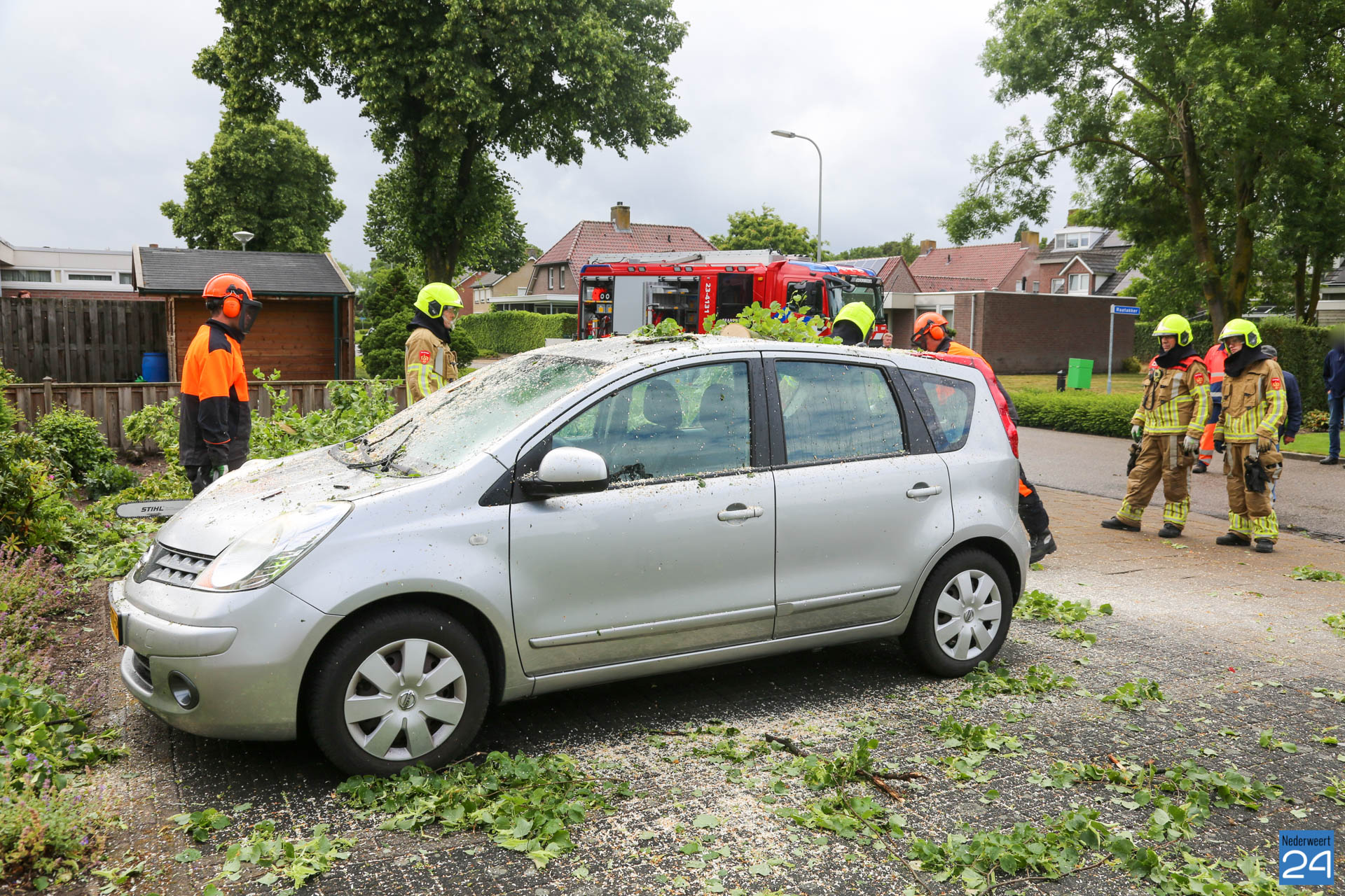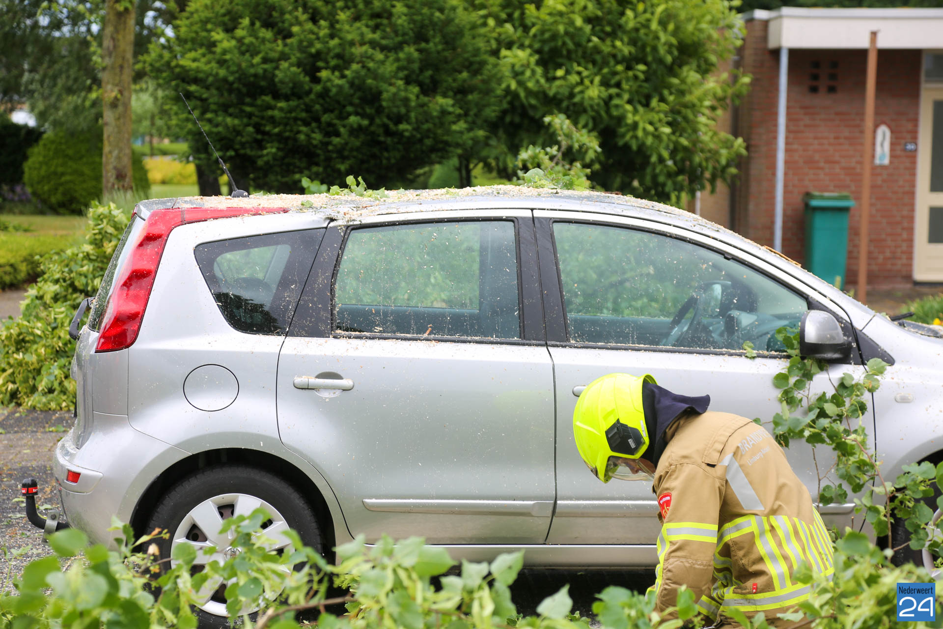 De auto stond geparkeerd op een parkeerplaats bij seniorenwoningen. De buurman hoorde een flinke klap. Toen hij ging kijken trof hij de ravage aan. De brandweer heeft de boom in stukken gezaagd. Daarna kwam de schade aan het voertuig tevoorschijn.