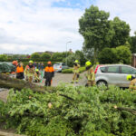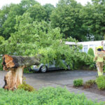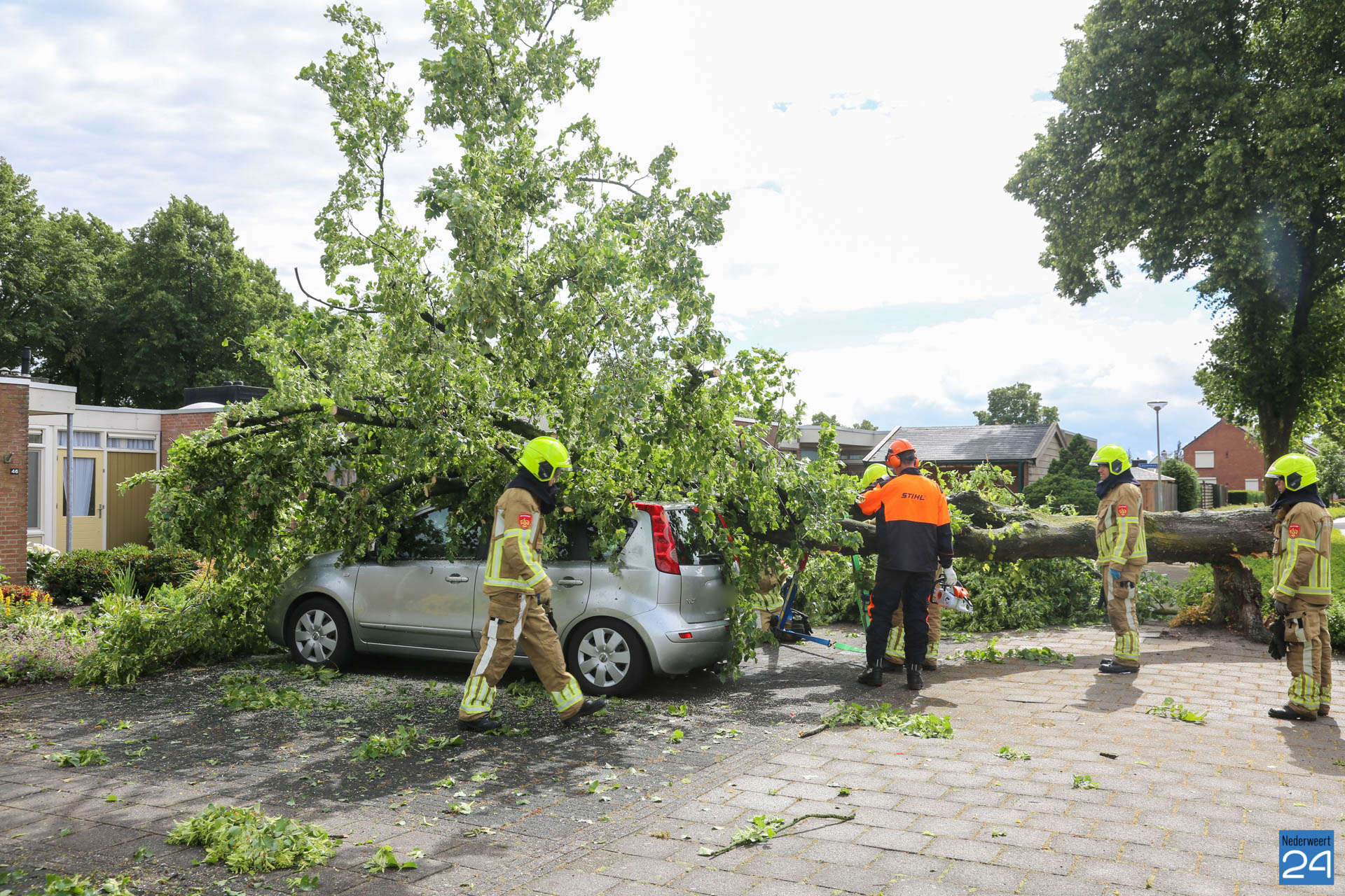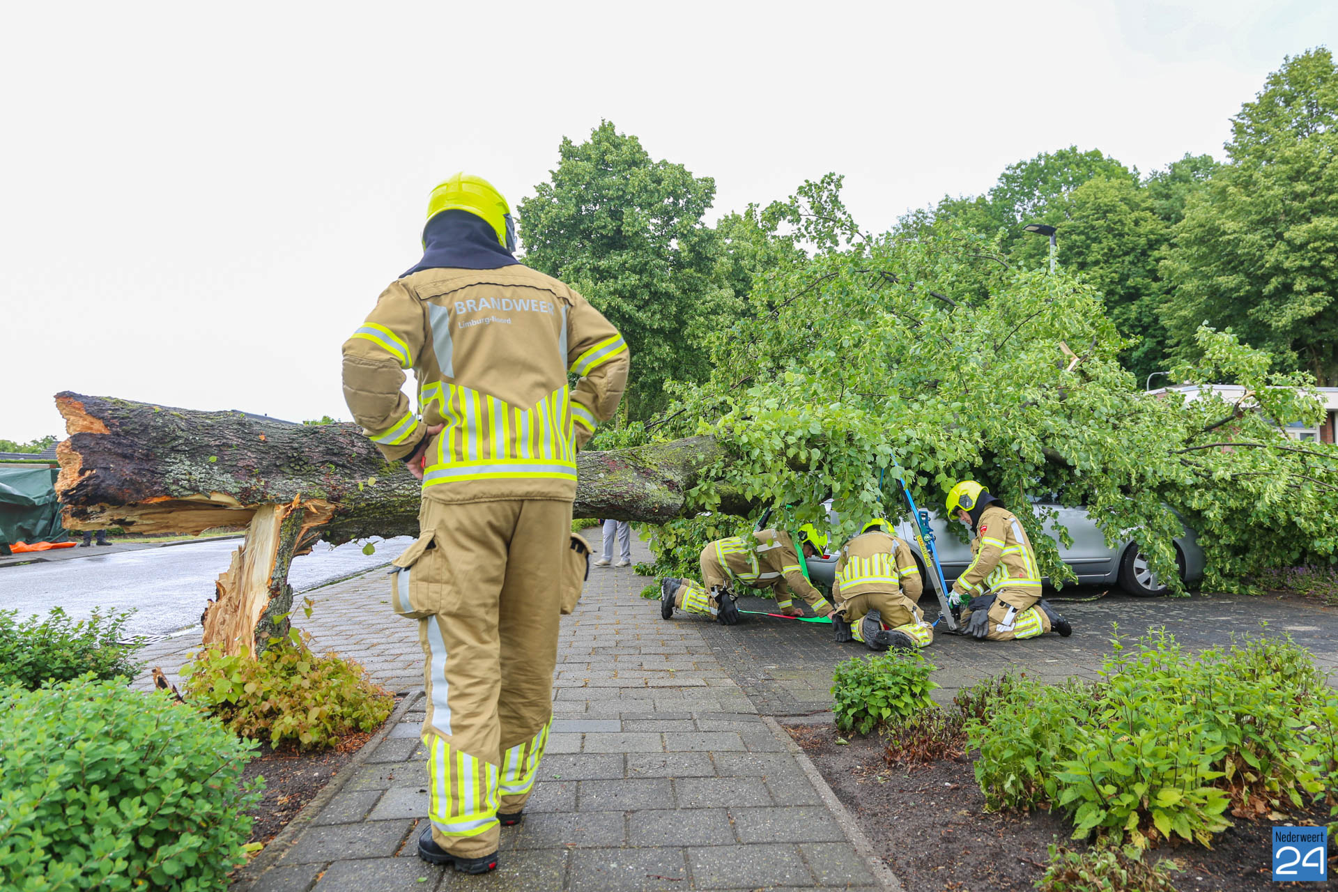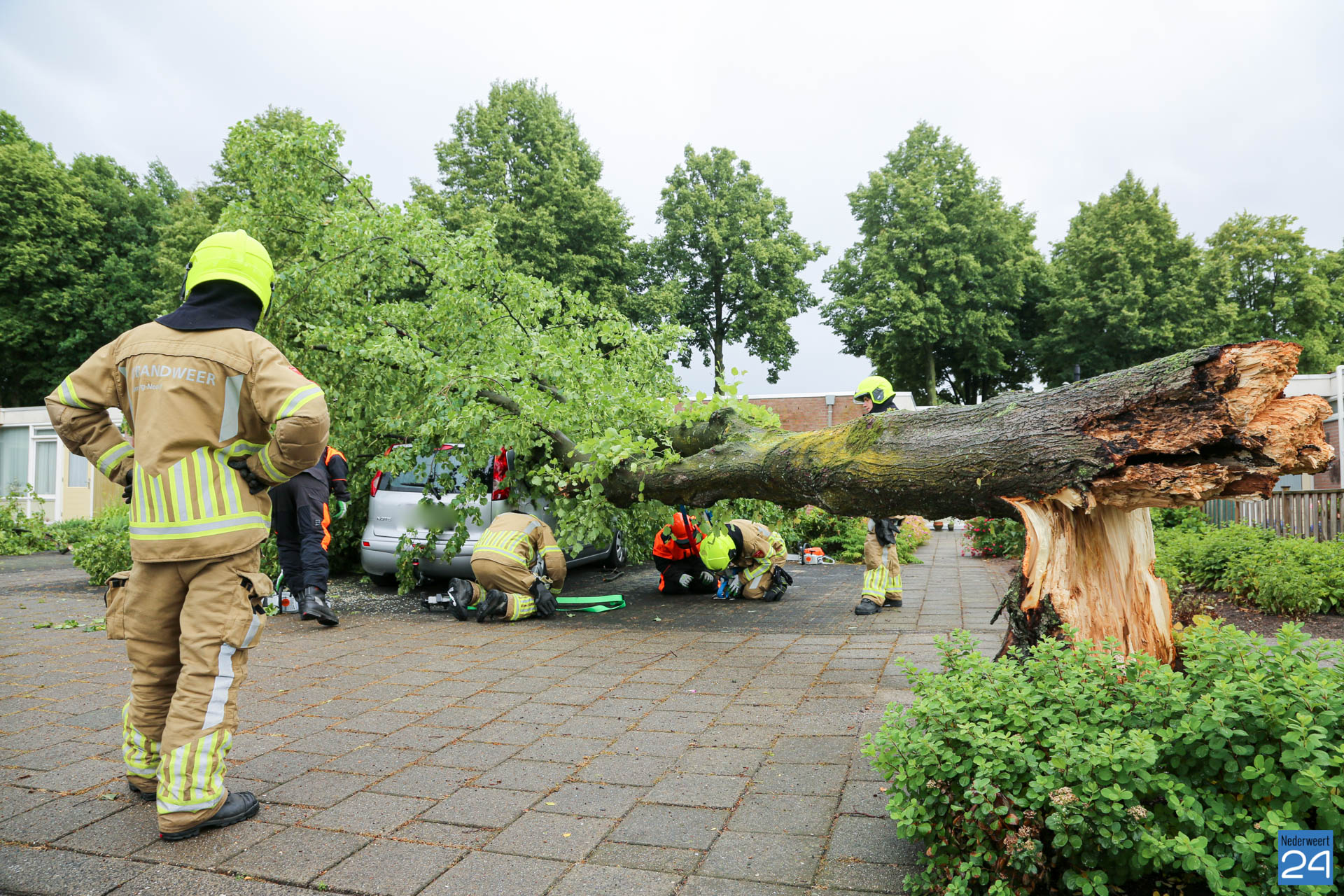 De auto stond geparkeerd op een parkeerplaats bij seniorenwoningen. De buurman hoorde een flinke klap. Toen hij ging kijken trof hij de ravage aan. De brandweer heeft de boom in stukken gezaagd. Daarna kwam de schade aan het voertuig tevoorschijn.