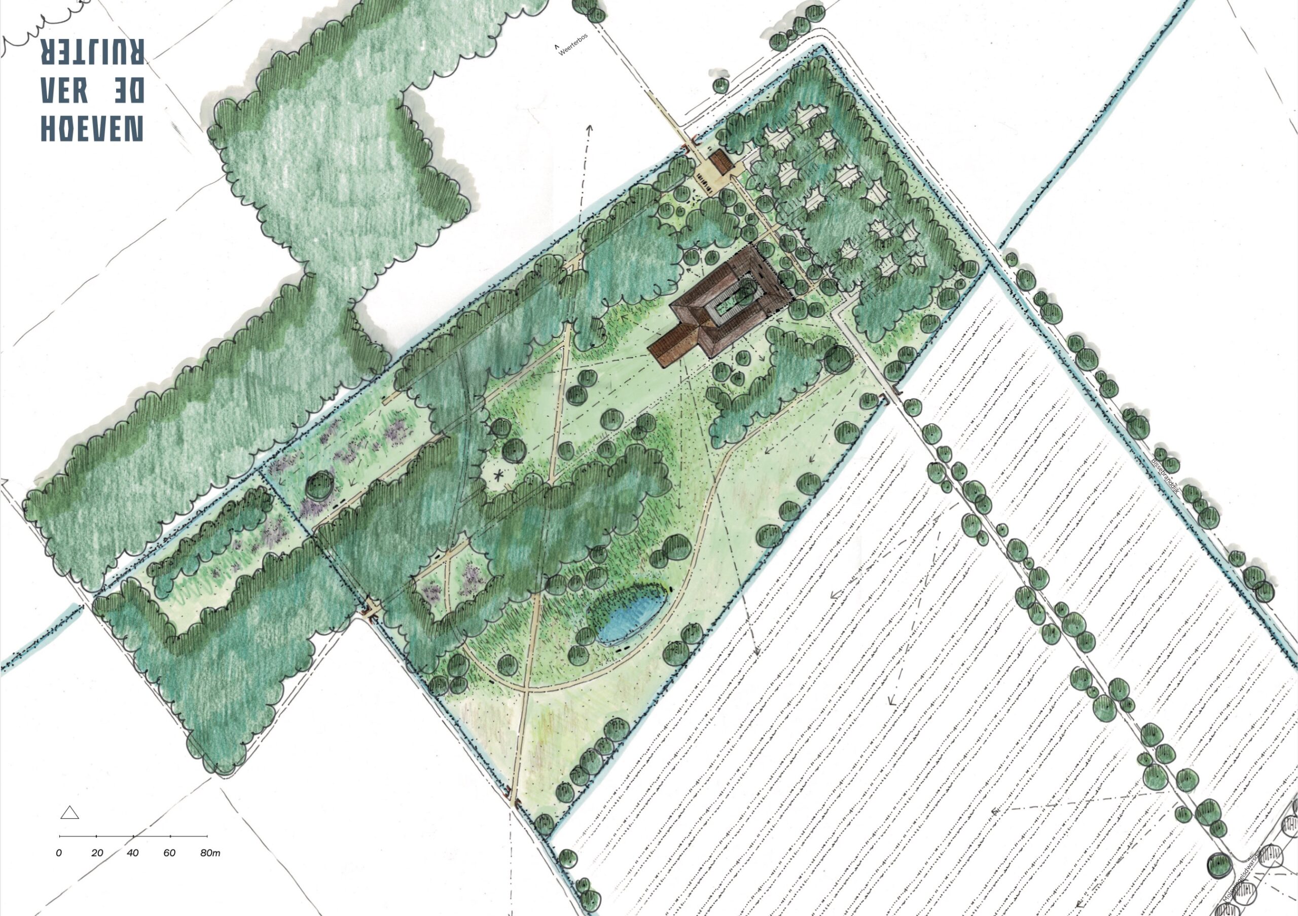Het crematorium dat Chris en Janneke voor ogen hebben, houdt die intieme sfeer juist vast. Het ademt rust en ruimte. Het gebouw oogt als een Limburgse hoeve en gaat volledig op in de natuur. Vanuit de aula kijk je uit op bos en heide. Buiten komen strooivelden en velden met gedenkbomen en eiken gedenkschijven. Het gebouw zelf wordt zo ontworpen dat gezelschappen elkaar voor en na de plechtigheid niet kruisen. Naast koffietafels is er ook ruimte voor andere activiteiten rond rouw en verlies zoals lezingen of voorlichtingsavonden. Verder komt er op het terrein een klein paviljoen voor wandelaars, fietsers en bezoekers van het crematorium. “Het meest bijzondere aan dit plan is de locatie. De ruimte en de stilte van de natuur. Na de crematieplechtigheid kun je even helemaal tot rust komen tijdens een wandeling door het Weerterbos of met een kopje koffie in het paviljoen.”