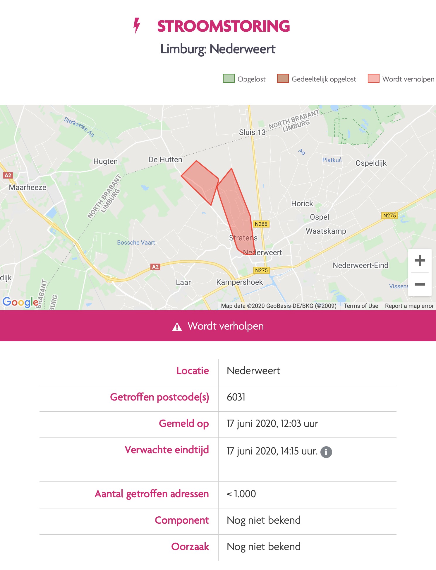 Een gedeelte aan de noordkant van Nederweert is woensdag rond de middag zonder stroom komen te zitten. De eerste melding is van 12:00 uur.