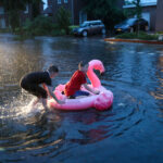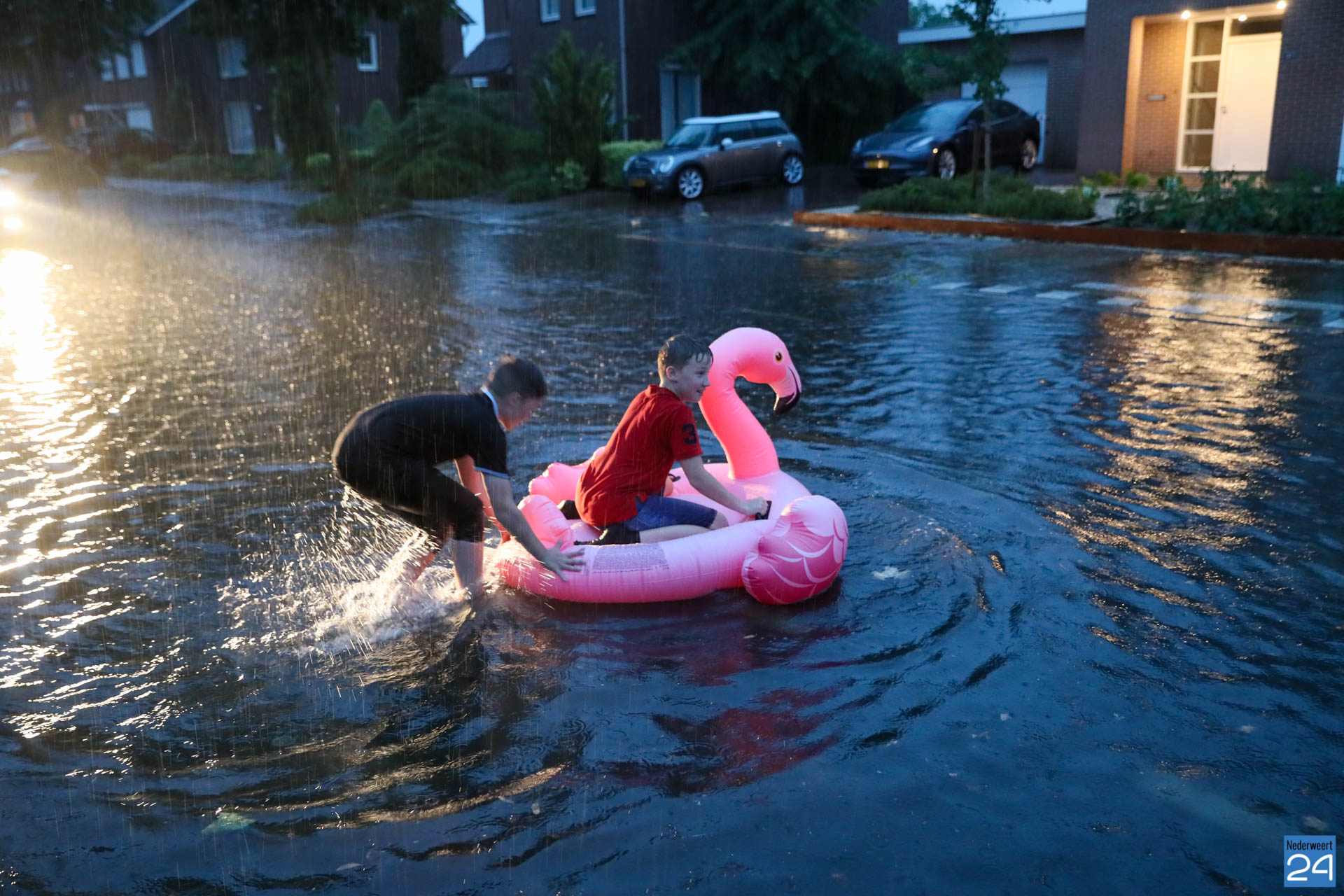 Het water zorgde ook voor plezier. Vooral in de Lochtstraat stond het water hoog. Hoog genoeg om met een zwembad door de straat te varen.