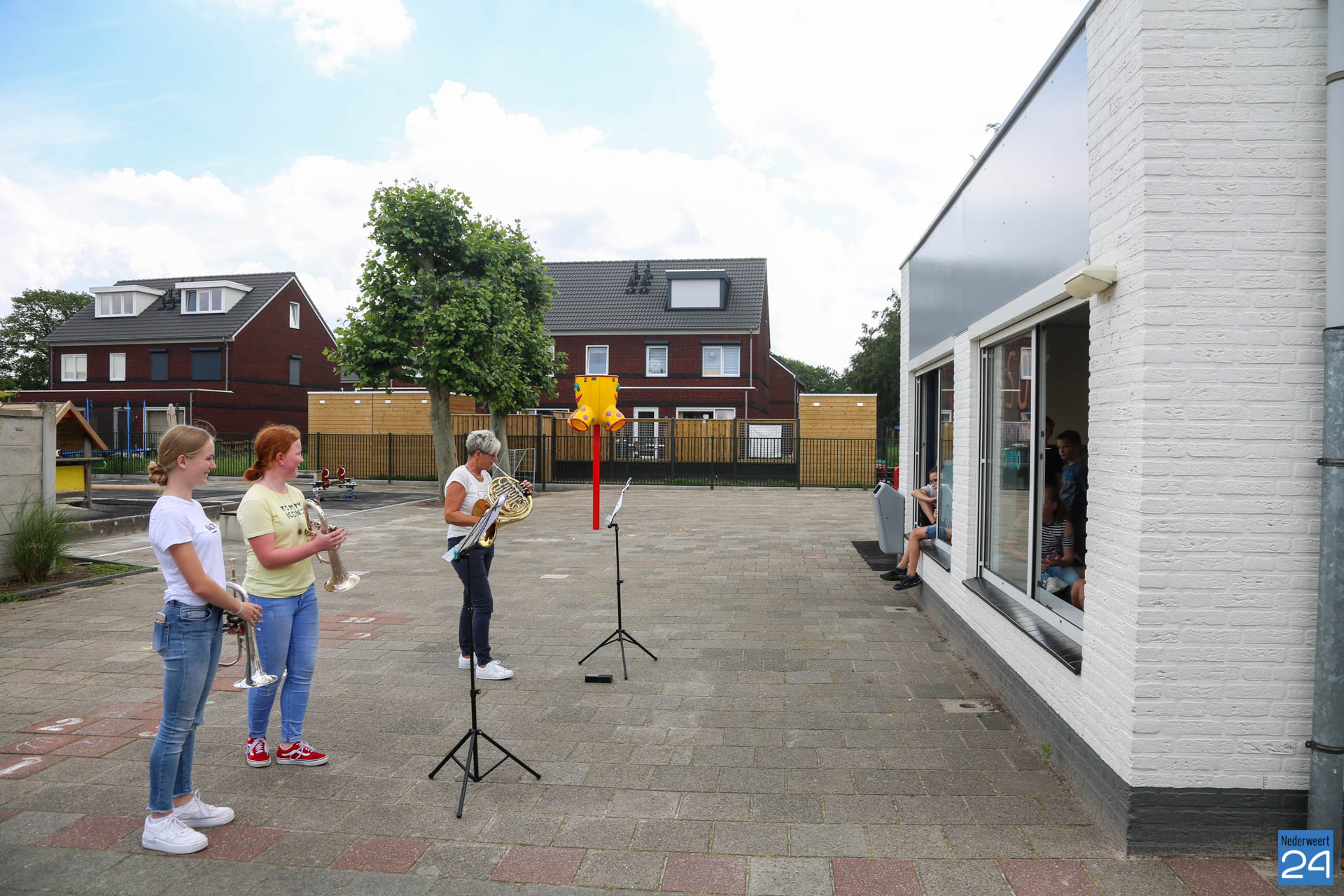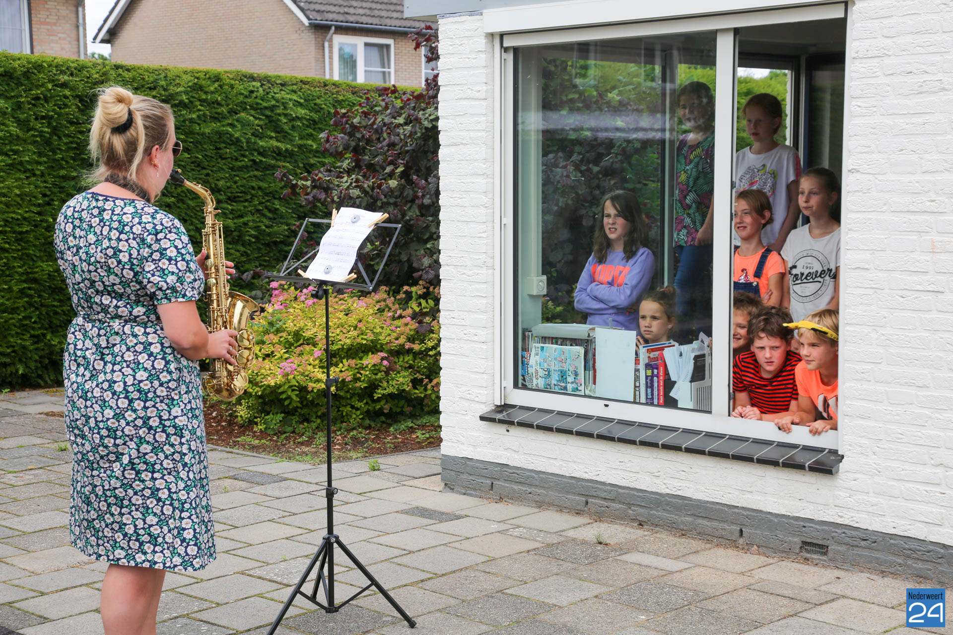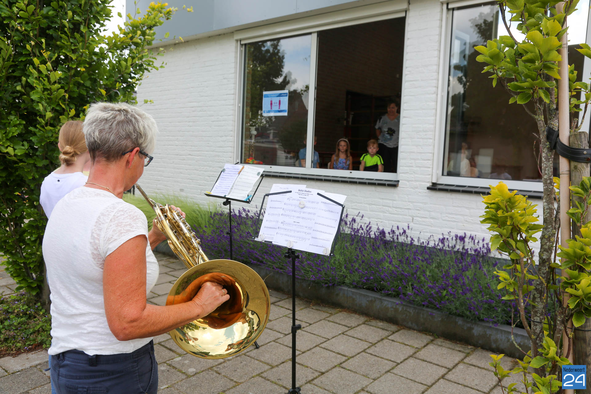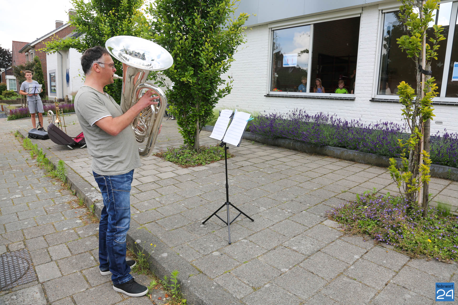 Voor 4 verschillende ramen, ieder aan een andere kant van de school, volgden de groepen 1-2, 3-4, 5-6 en 7-8 de optredens door leden van de fanfare. Zo maakten de leerlingen kennis met de bugel en de trompet, de hoorn, trombone en bas, de saxofoon en het slagwerk. De leerkrachten in de klas voorzagen de leerlingen van de benodigde achtergrondinformatie. Ook werd er gesproken over hoe ze de instrumenten vonden klinken en welk gevoel de muziek bij hen opriep. Daarnaast werd er een link gelegd met de vele raamconcerten die gegeven zijn in de coronaperiode. Als afsluiting speelden alle muzikanten samen voor alle ramen The Lions leeps Tonight.