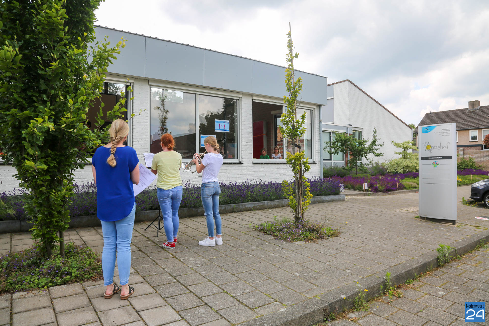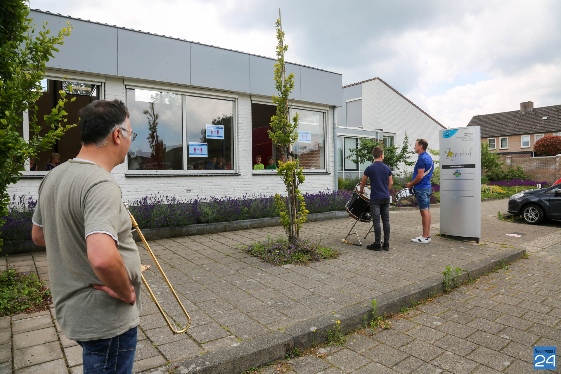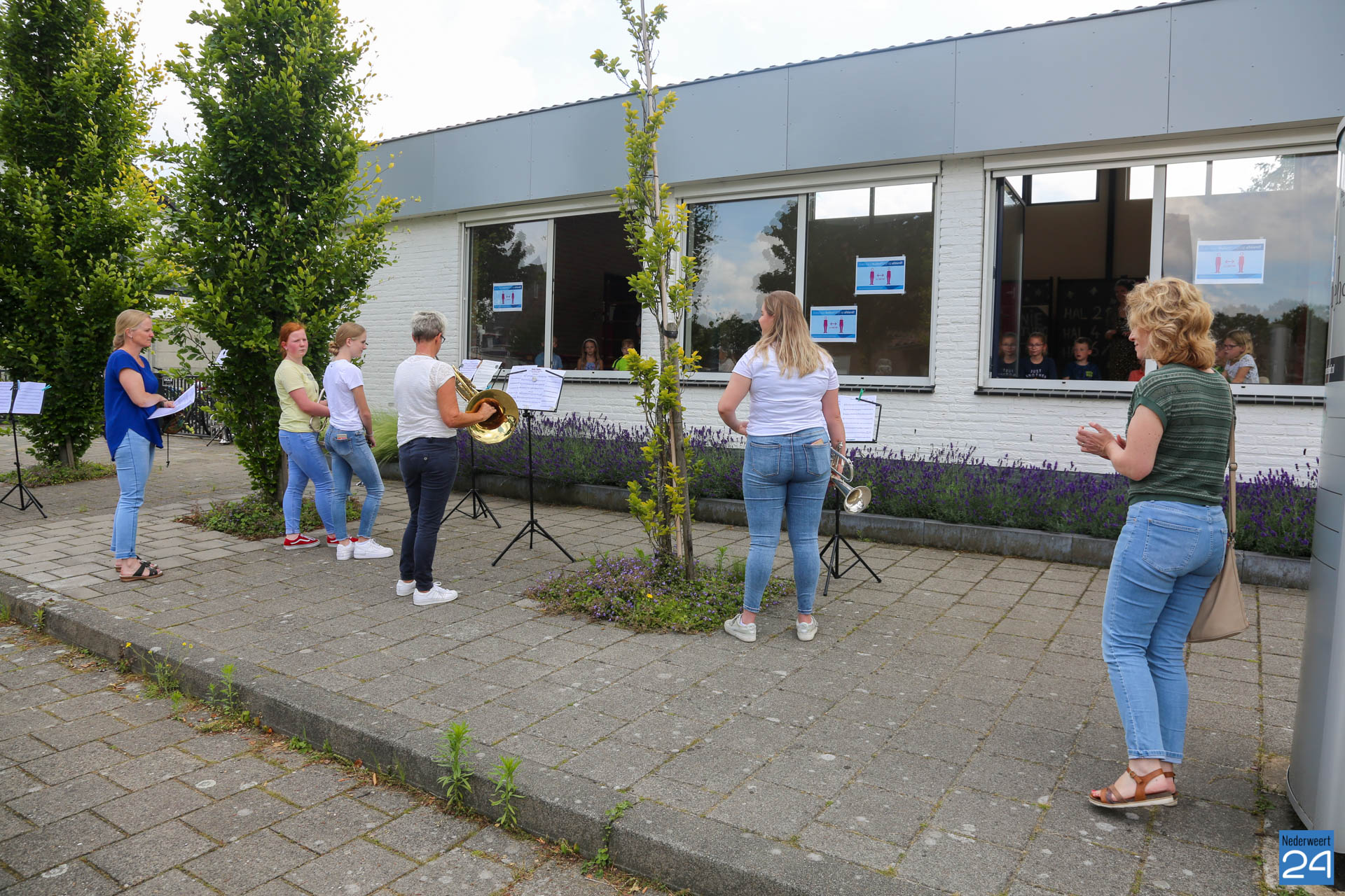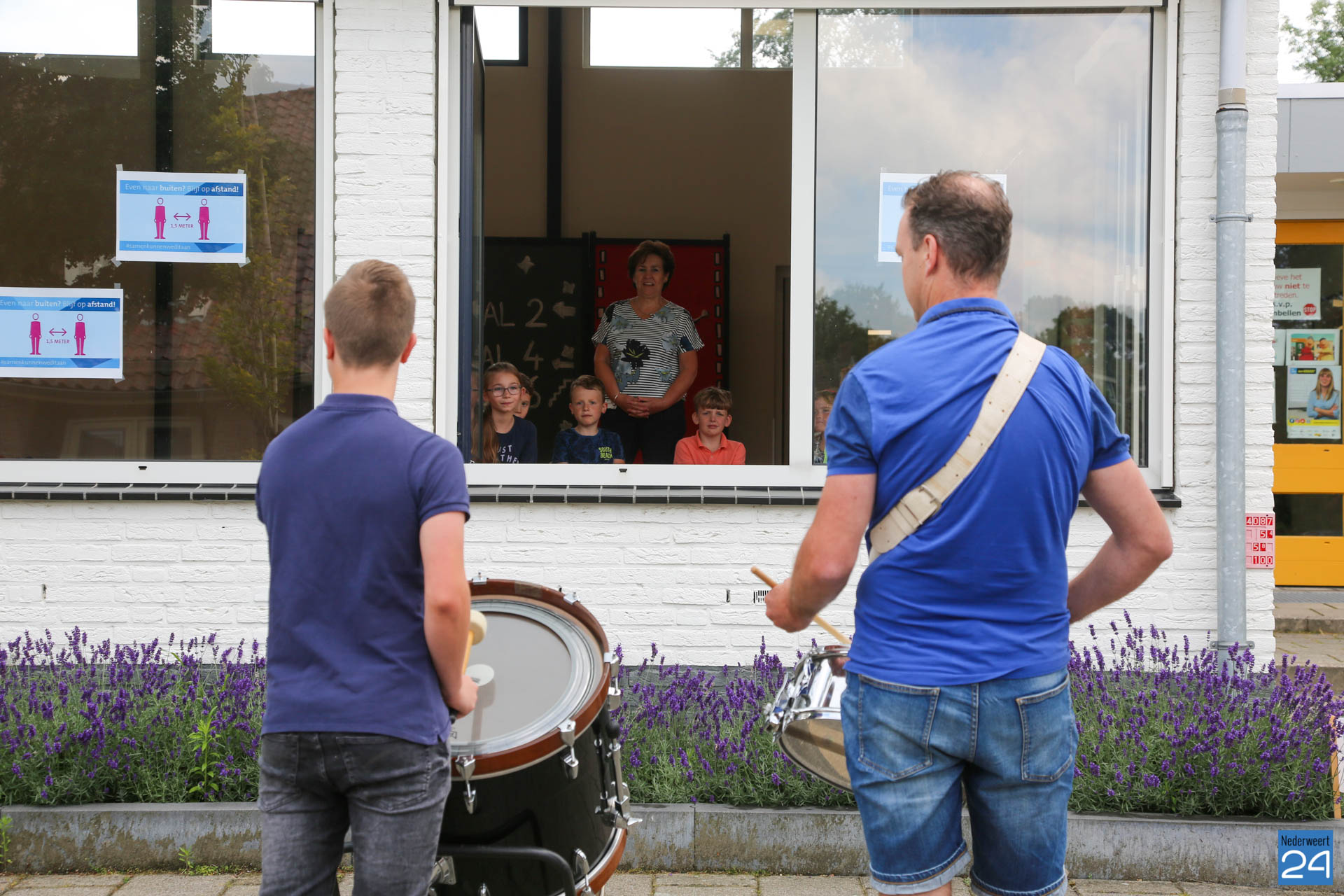 Voor 4 verschillende ramen, ieder aan een andere kant van de school, volgden de groepen 1-2, 3-4, 5-6 en 7-8 de optredens door leden van de fanfare. Zo maakten de leerlingen kennis met de bugel en de trompet, de hoorn, trombone en bas, de saxofoon en het slagwerk. De leerkrachten in de klas voorzagen de leerlingen van de benodigde achtergrondinformatie. Ook werd er gesproken over hoe ze de instrumenten vonden klinken en welk gevoel de muziek bij hen opriep. Daarnaast werd er een link gelegd met de vele raamconcerten die gegeven zijn in de coronaperiode. Als afsluiting speelden alle muzikanten samen voor alle ramen The Lions leeps Tonight.