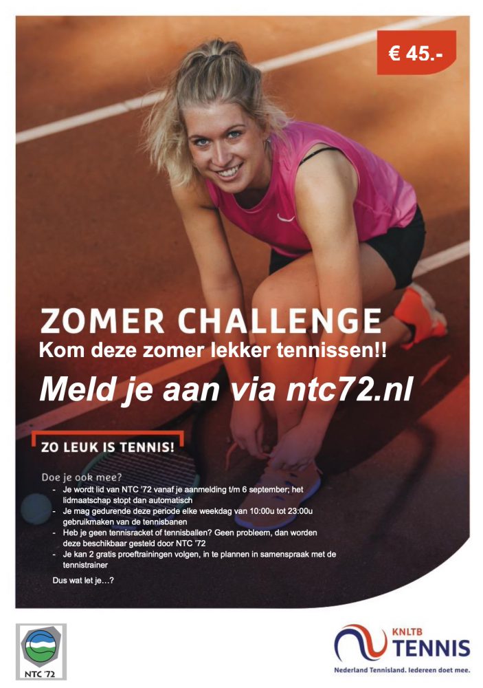 Ook voor beoefenaars van sporten die een zomerstop kennen, is een zomerabonnement interessant om de sportieve conditie op peil te houden. Maak kennis met tennis, en ervaar hoe leuk deze sport is! Aanmelden kan via de website, ntc72.nl. Hier is ook alle verdere informatie te vinden. Voor 45 Euro wordt je tot 6 september lid van de tennisclub, en kan je twee introductietrainingen volgen. Als je geen tennisracket of tennisballen hebt is dat geen probleem: deze worden door de tennisvereniging desgewenst ter beschikking gesteld.