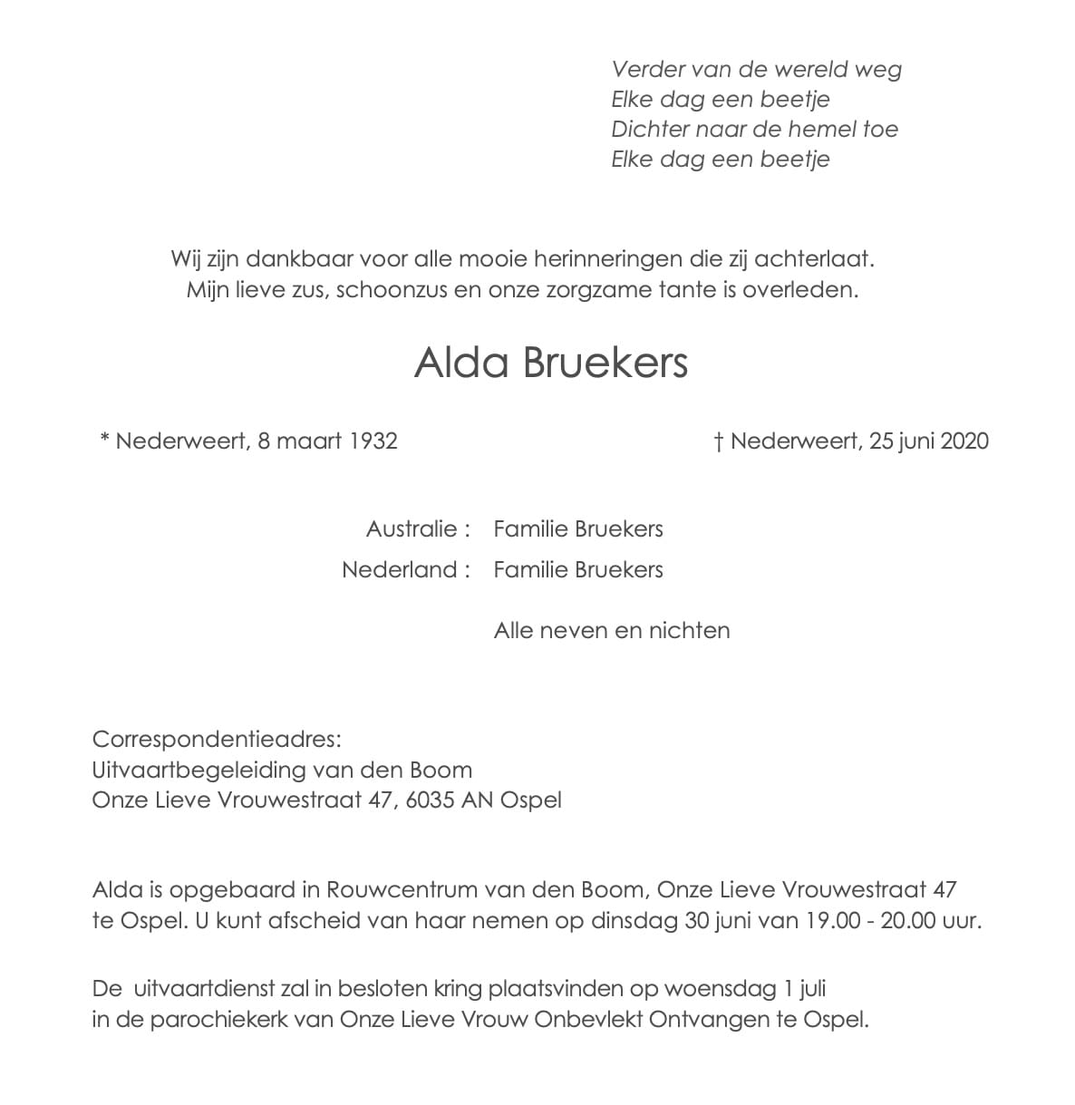 Overlijdensbericht: Alda Bruekers †