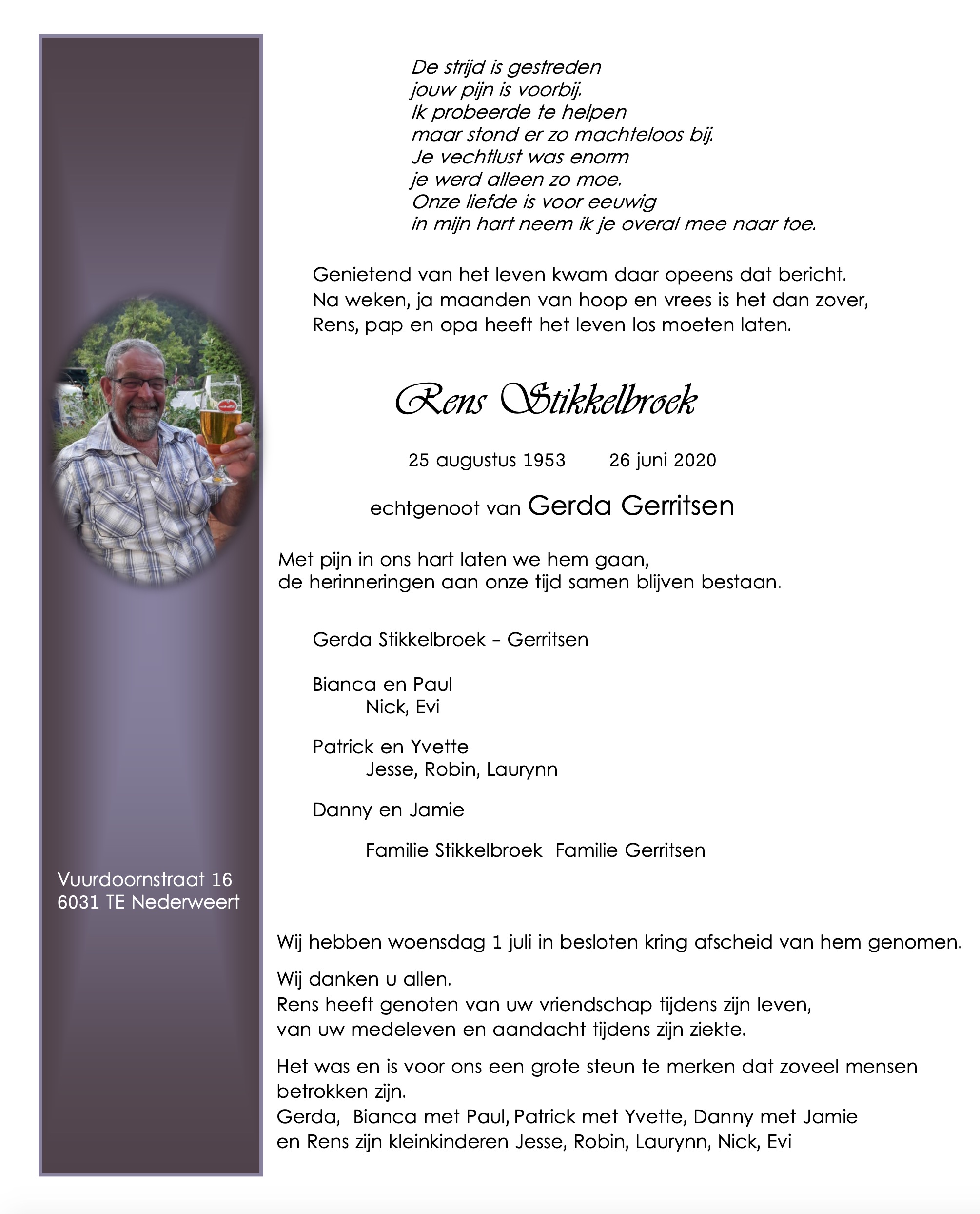 Gecondoleerd Gerda en kinderen met het overlijden van Rens.