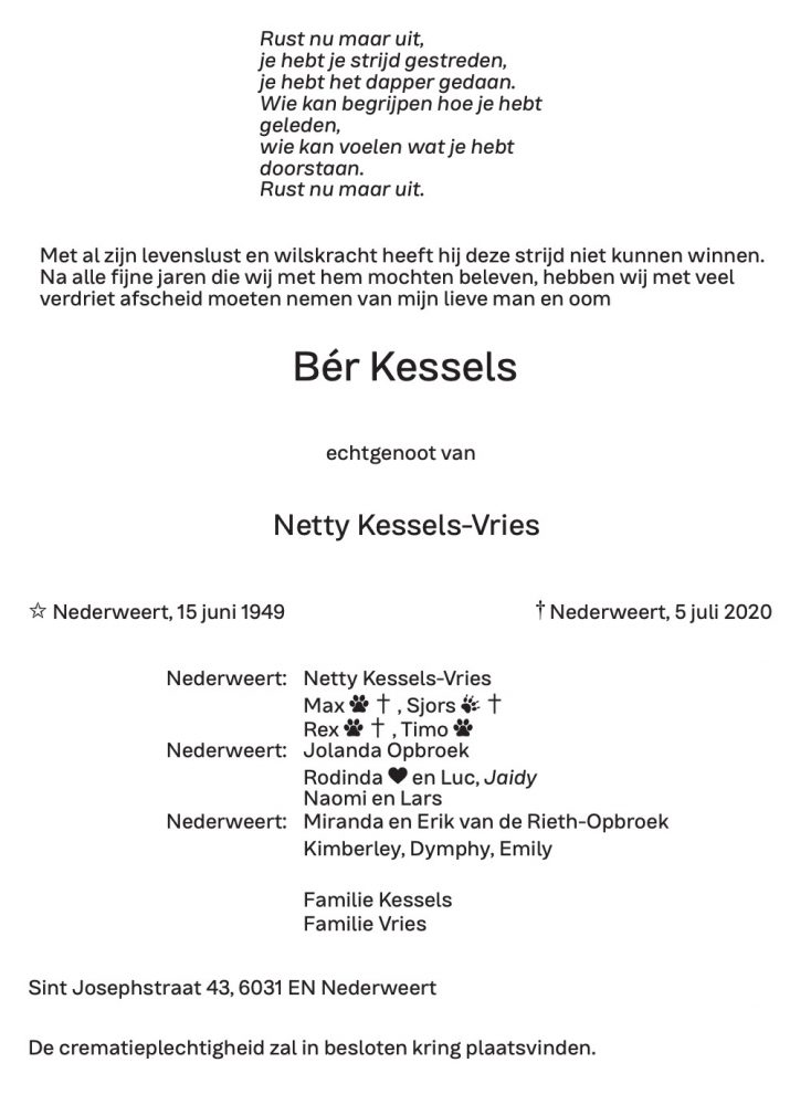 Heel veel sterkte Nettie met het verlies van Ber. Ook aan familie Kessels en Vries veel sterkte.