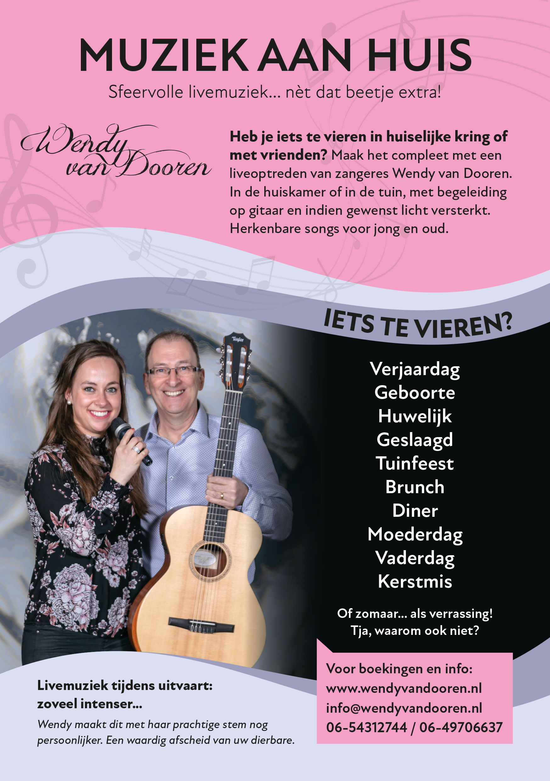 In plaats van muziek op locatie brengt Wendy deze live naar je toe: MUZIEK AAN HUIS. In de huiskamer of in de tuin wordt jouw speciale dag, feestje of verrassing een bijzonder en onvergetelijk moment. Want sfeervolle livemuziek… dat is nèt dat beetje extra!