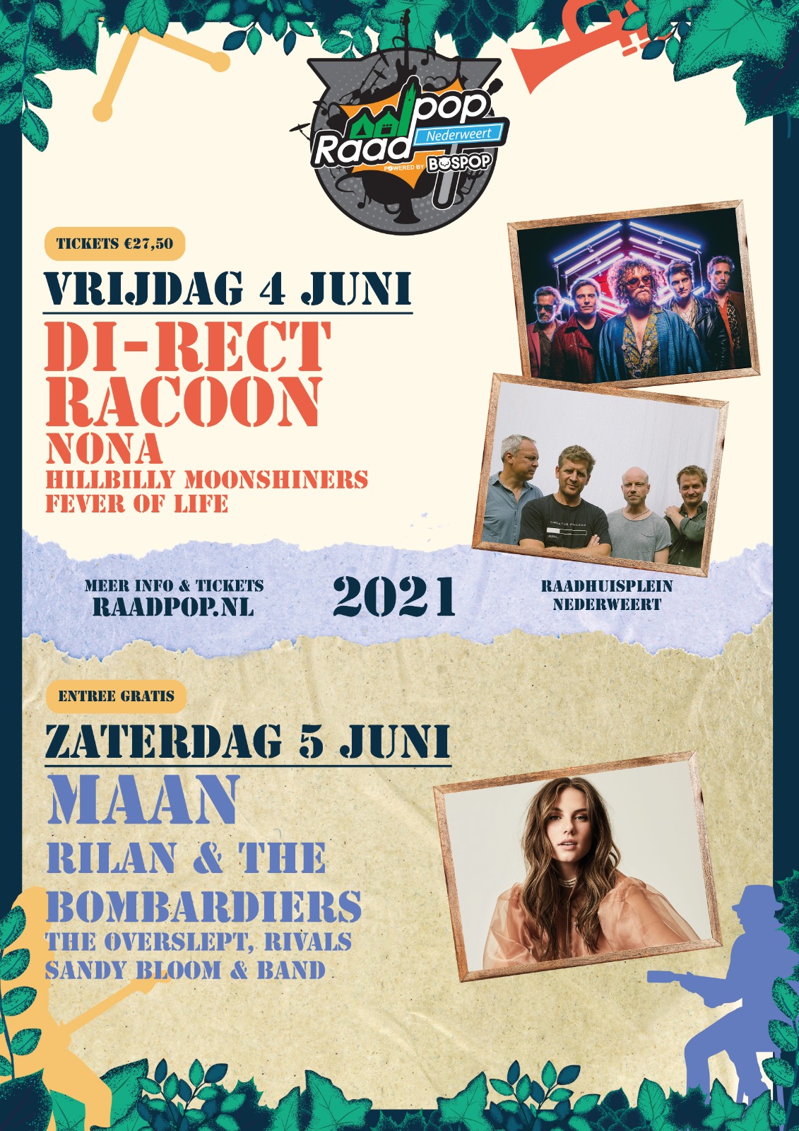 In het weekend van 4 en 5 juni 2021 vindt op het Raadhuisplein in Nederweert alsnog de 6e editie van Raadpop plaats. Door de Corona crisis en het verbod op grootschalige evenementen kon om begrijpelijke redenen Raadpop 2020 niet doorgaan. We hebben jullie even om geduld moeten vragen zodat we op de achtergrond alle voorbereidingen konden treffen, maar inmiddels kunnen we goed nieuws melden. Het volledige programma van Raadpop 2020 wordt meegenomen naar 2021. Ook de Nederlandse top bands Racoon, Di-Rect, Maan en Nona komen volgend jaar dus terug.