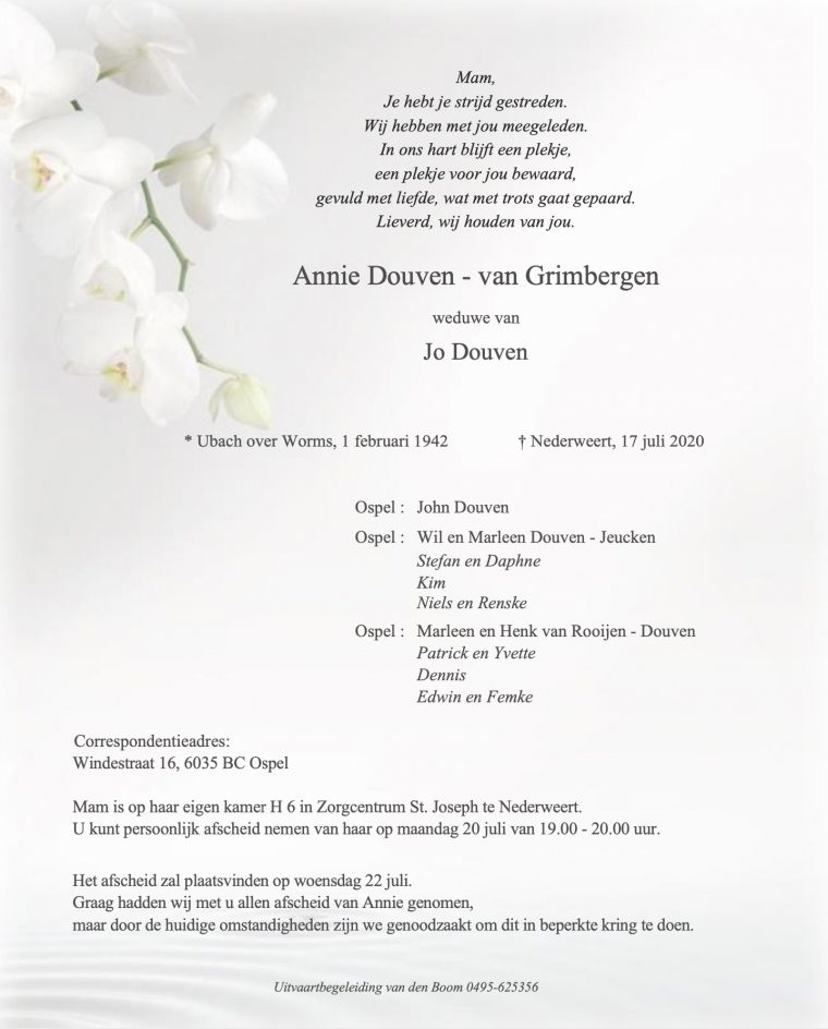Overlijdensbericht: Annie Douven – van Grimbergen